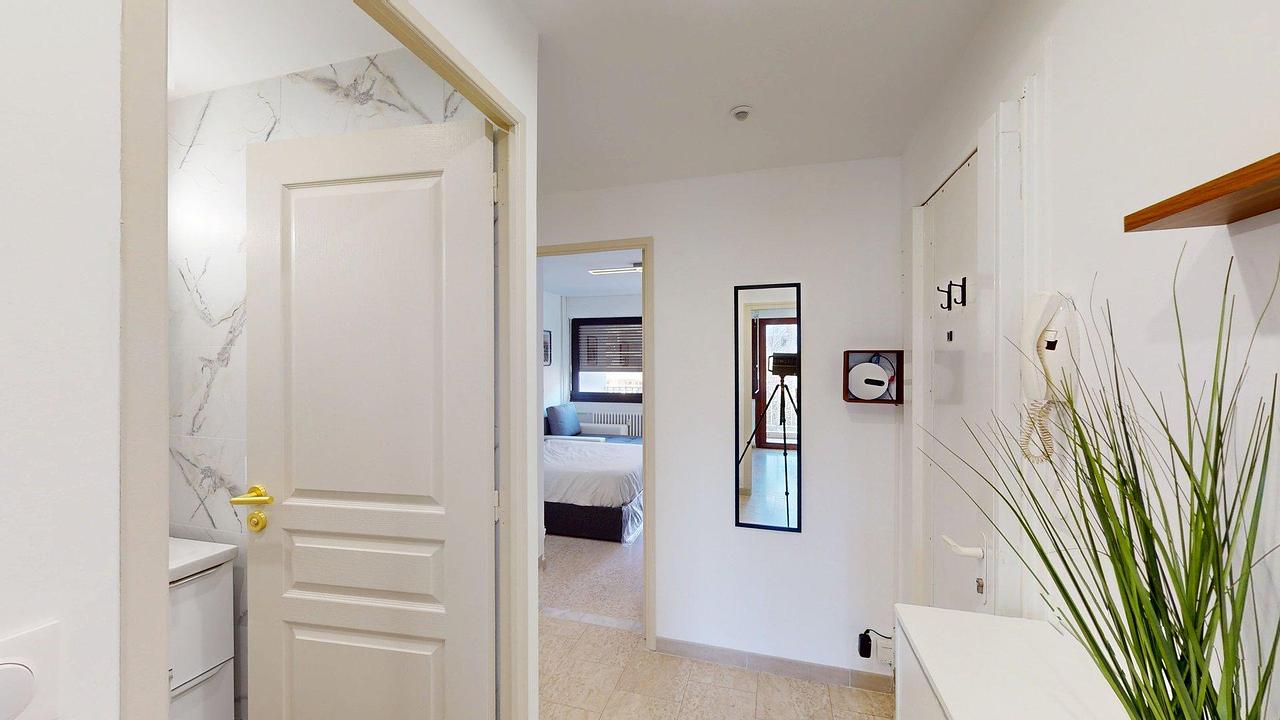 La chambre 1 est spacieuse et très fonctionnelle. Elle est équipée d’un lit double, d’un bureau avec chaise et lampe, d’un placard ainsi que d’une grande et d’une petite commode, offrant de nombreux rangements. Elle bénéficie en plus d’un accès direct à une loggia vitrée, apportant luminosité et espace supplémentaire 🌿.