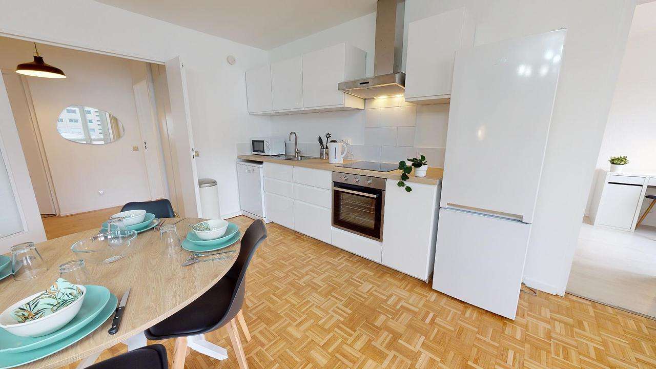 Cette colocation comprend une pièce de vie lumineuse avec une cuisine ouverte équipée : four, frigo, plaques de cuisson, hotte, micro-ondes, lave-vaisselle, rangements, etc. et un salon.