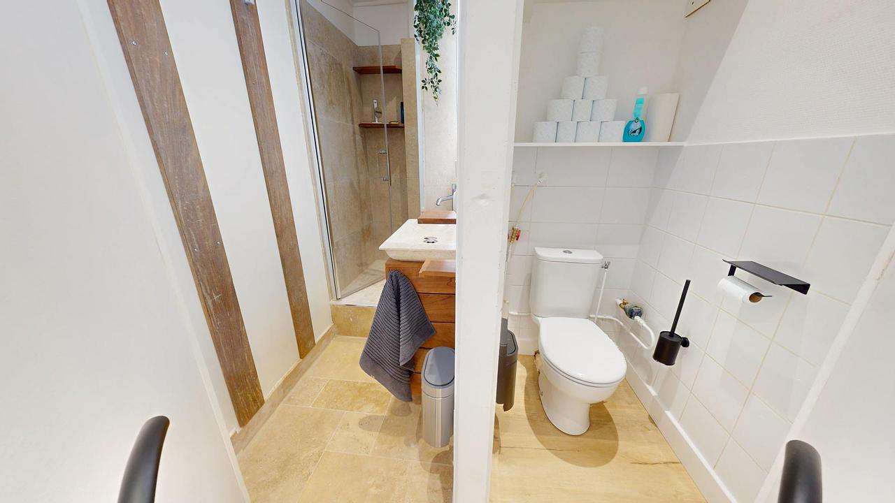 La salle d'eau dispose d'une grande douche ainsi que d'un meuble vasque avec un miroir. Les toilettes sont séparées.