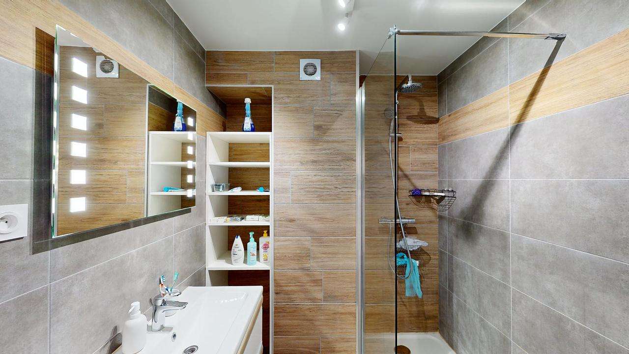Cet appartement offre deux salles d'eau, chacune dispose d'une douche, d'un meuble vasque, d'un sèche serviette, d'un miroir et de rangements. Les toilettes sont séparées.
