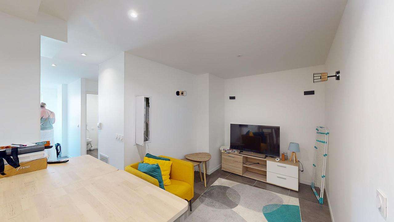 L'appartement s'ouvre sur une entrée avec rangements desservant un séjour avec cuisine ouverte. Celui-ci dispose d'un fauteuil, d'un meuble TV avec TV, une table haute avec 4 chaises.