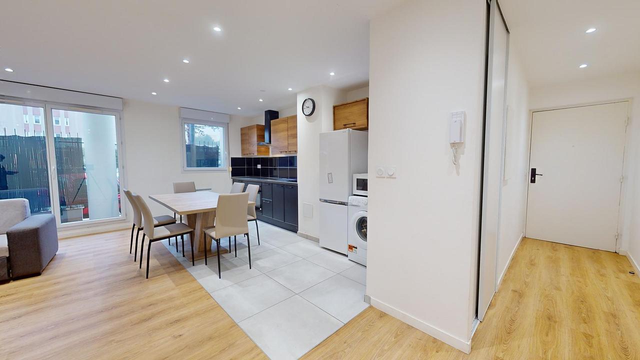 Cet appartement s'ouvre sur une grande pièce de vie aménagée d'un canapé d'angle, d'une table basse, d'un meuble ainsi que d'une table avec six chaises, idéal pour partager des repas entre colocataires.