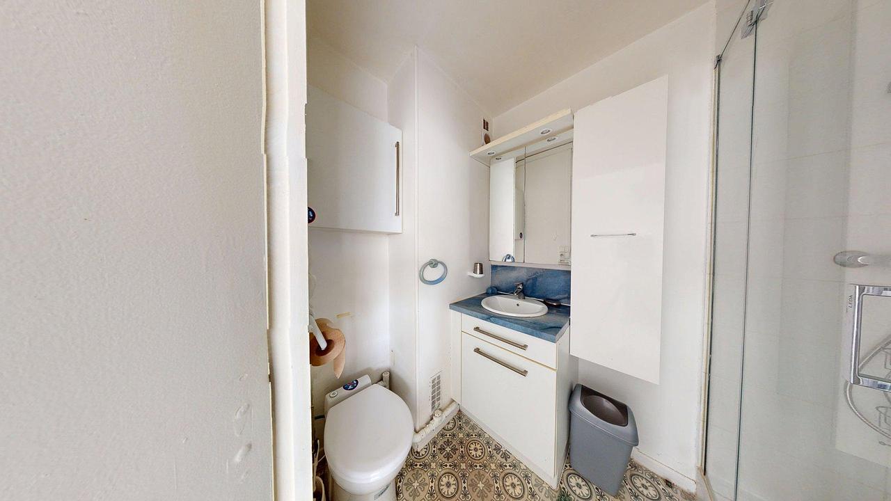La salle d’eau comprend une douche, un meuble vasque avec miroir, un WC intégré, un sèche-serviette et des rangements complémentaires.