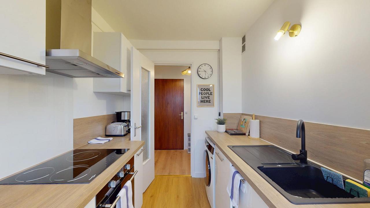 LES ESPACES COMMUNSLa pièce de vie, chaleureuse et conviviale, est aménagée avec un canapé, une table basse, un projecteur pour vos soirées cinéma et une table à manger avec des tabourets. Elle offre un accès direct au balcon, parfait pour profiter de l’extérieur.