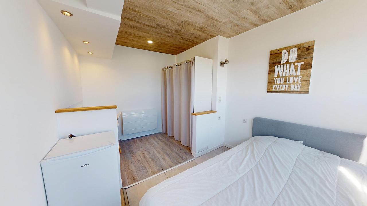 La chambre est équipée d'un lit double, d'un bureau, d'un placard et d'un réfrigérateur.
