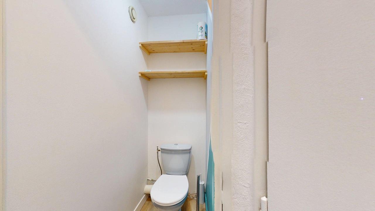 L’appartement comprend également une salle d’eau avec douche à l’italienne, équipée d’un meuble vasque avec point d’eau, d’un miroir et d’un meuble de rangement, ainsi qu’un WC séparé pour plus de confort.
