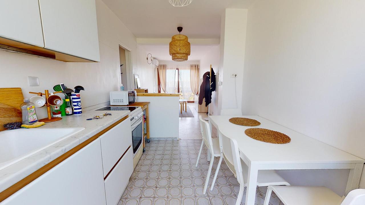 L’entrée du logement s’ouvre sur les parties communes à savoir une cuisine et un séjour. La cuisine est équipée d’une table à manger, d’un four, de 4 plaques électriques, d’un lave-vaisselle, d’un micro-onde ainsi que de plusieurs rangements. Le salon quant à lui dispose d’un canapé, d’un double table basse, d’un meuble TV et d’un TV. Une tabler et 4 chaises vous attendent sur la balcon pour profiter des beaux jours.