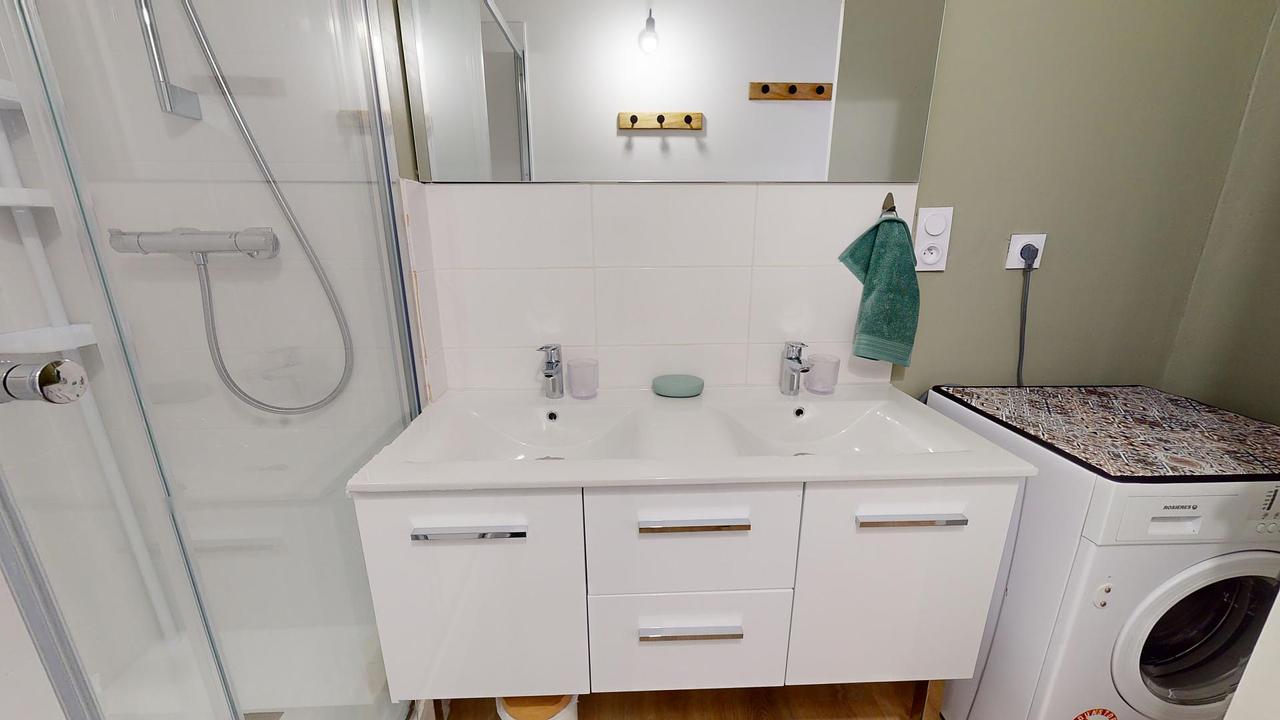 Cette colocation dispose de 2 salles d'eau : une première avec double vasque, douche et lave-linge ; ainsi qu'une seconde avec douche et meuble vasque. Les toilettes sont séparées.