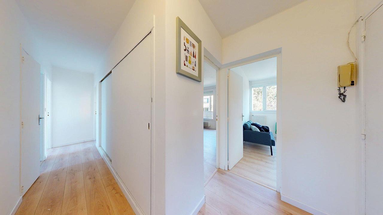 Le logement dispose également de placards de rangement dans le couloir et bénéficie d’un parquet, apportant chaleur et confort.