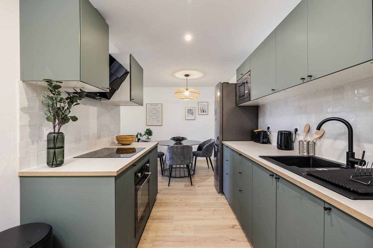 La cuisine, moderne et entièrement équipée, dispose de plaques de cuisson, d’une hotte, d’un évier, d’un réfrigérateur, d’un four, d’un micro-ondes ainsi que de nombreux rangements et ustensiles indispensables au quotidien.