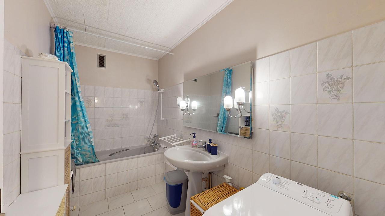 Une salle de bain avec une baignoire, un lavabo, un miroir, des placards à rangement et une machine à laver.