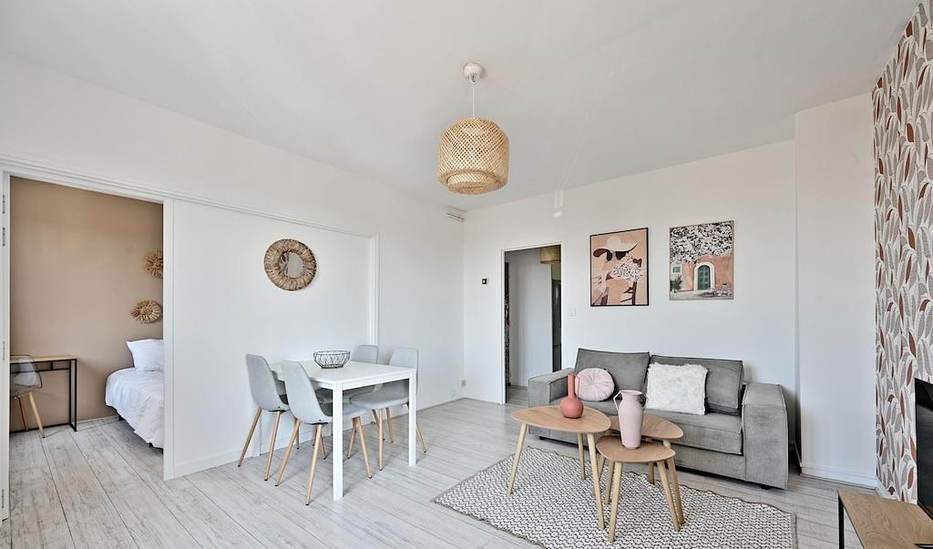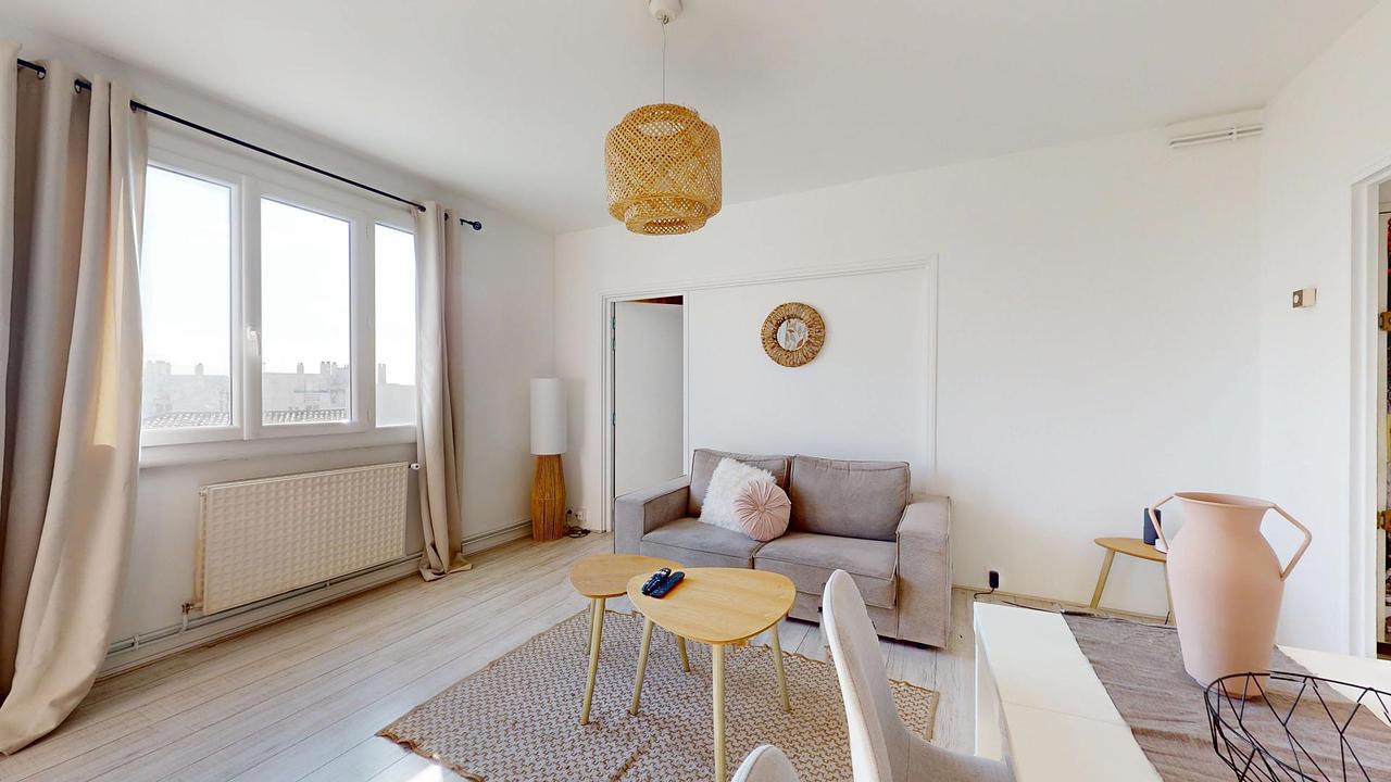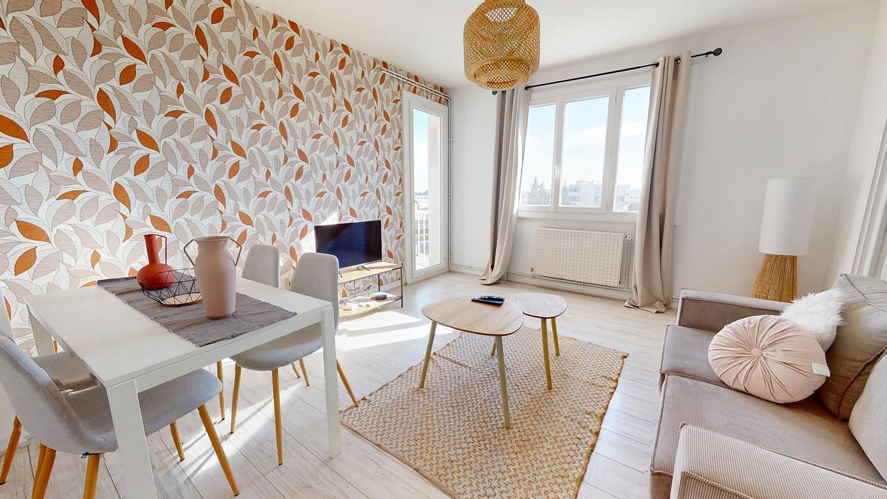 Cette colocation de trois chambres s'ouvre sur une pièce de vie aménagée d'un canapé, de tables basses gigognes, d'un meuble TV avec une télévision ainsi que d'une table avec quatre chaises, idéal pour partager des repas entre colocataires.