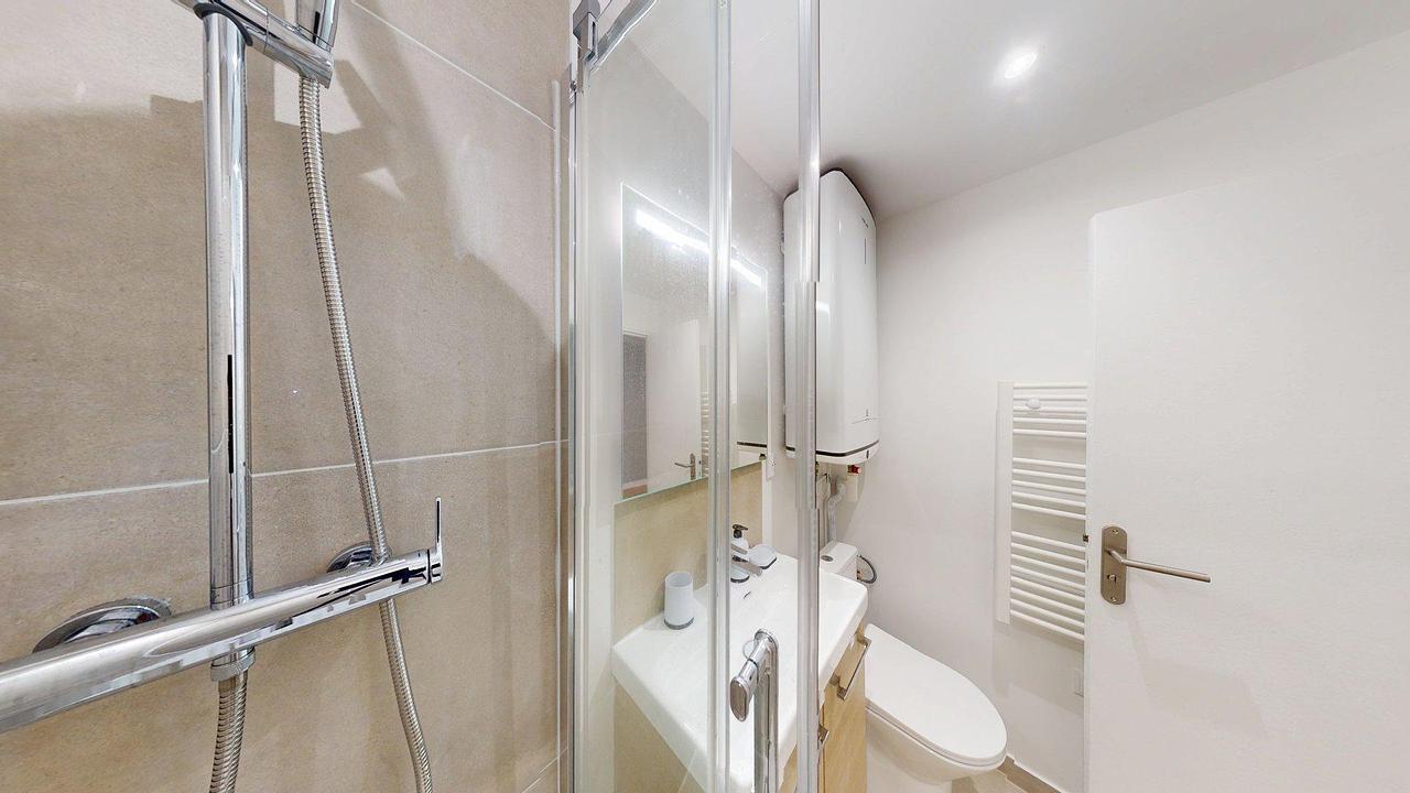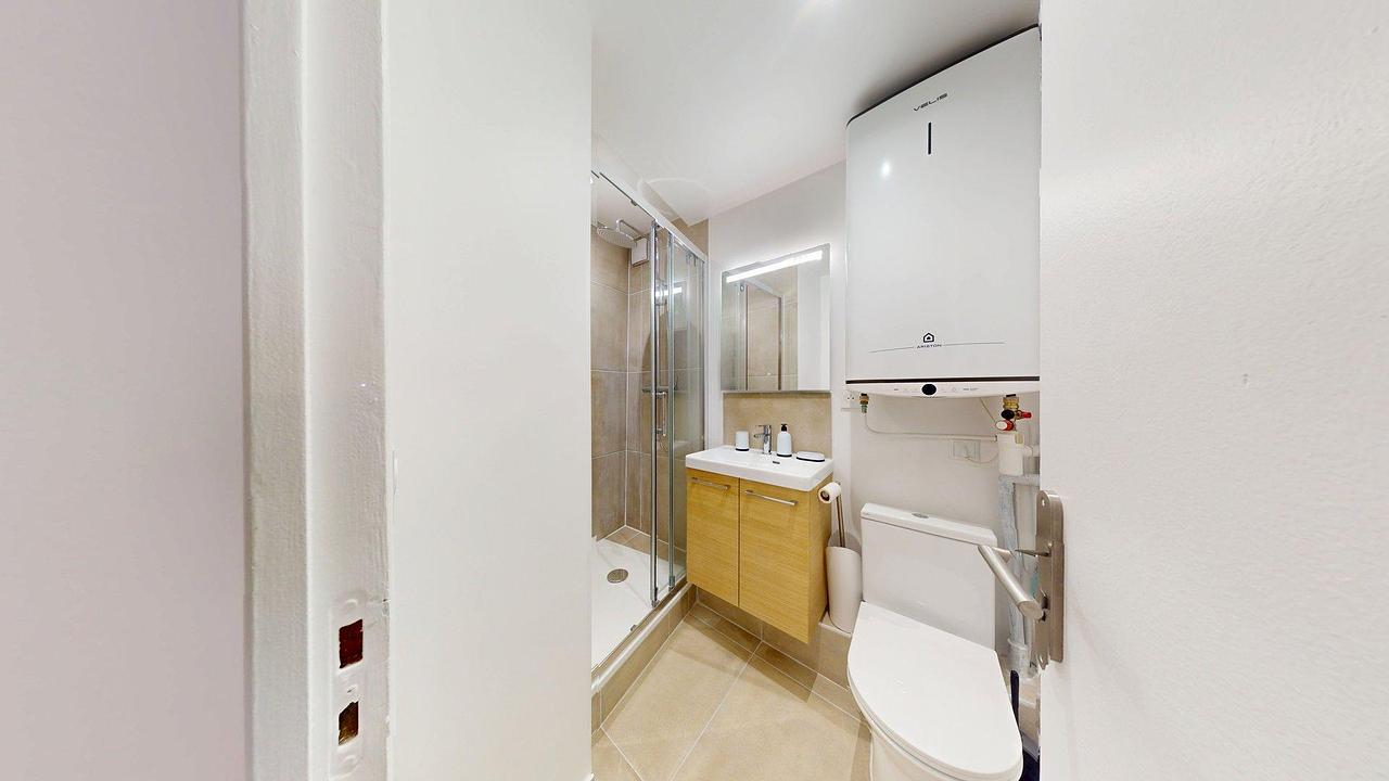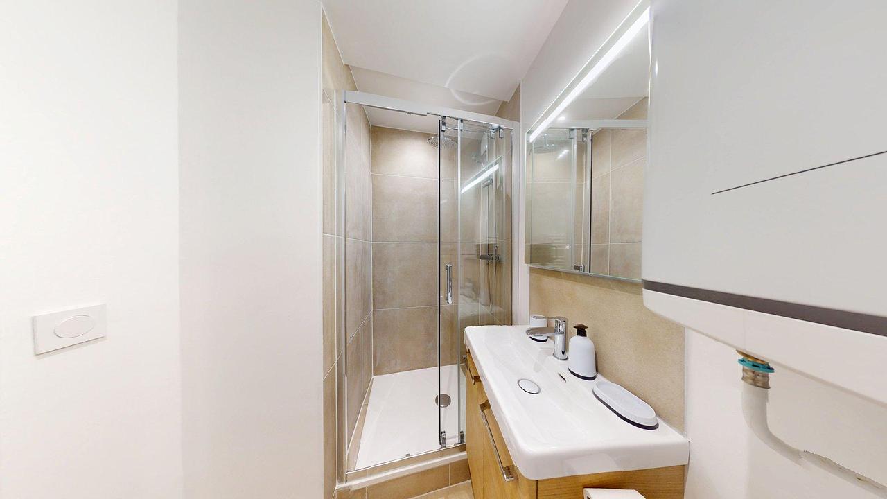 Enfin, la salle d'eau moderne et fonctionnelle comprend une douche spacieuse, un meuble vasque avec miroir ainsi que les WC.