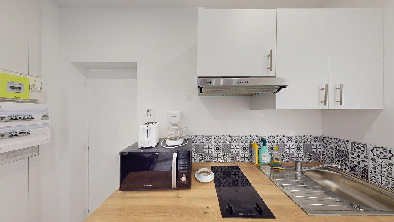 La cuisine ouverte est équipée avec des plaques de cuisson, un micro-ondes et un réfrigérateur. Elle dispose de rangements et intègre un lave-linge pour votre plus grand confort. Le logement est également équipé d'un aspirateur et d'une table à repasser.