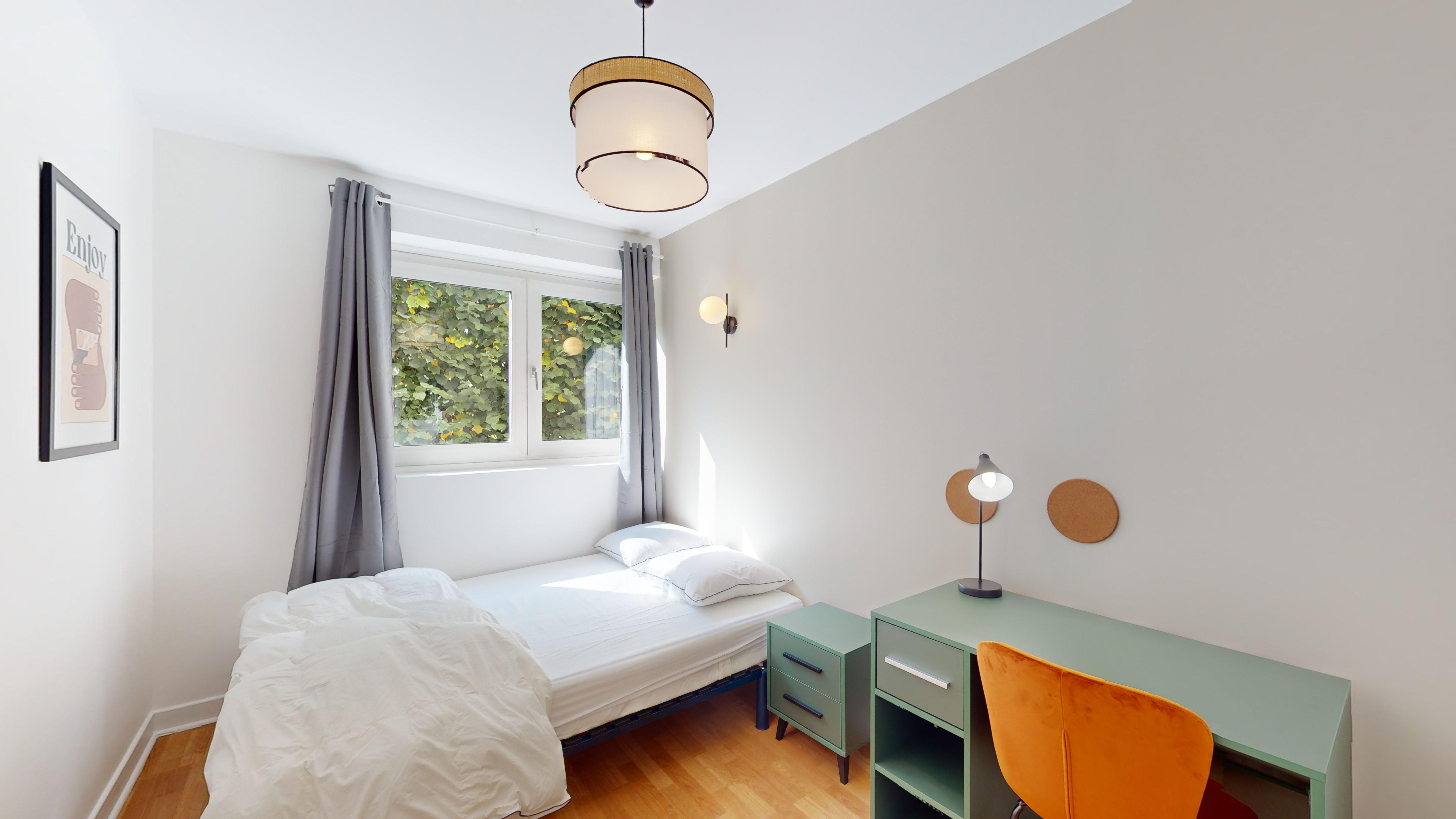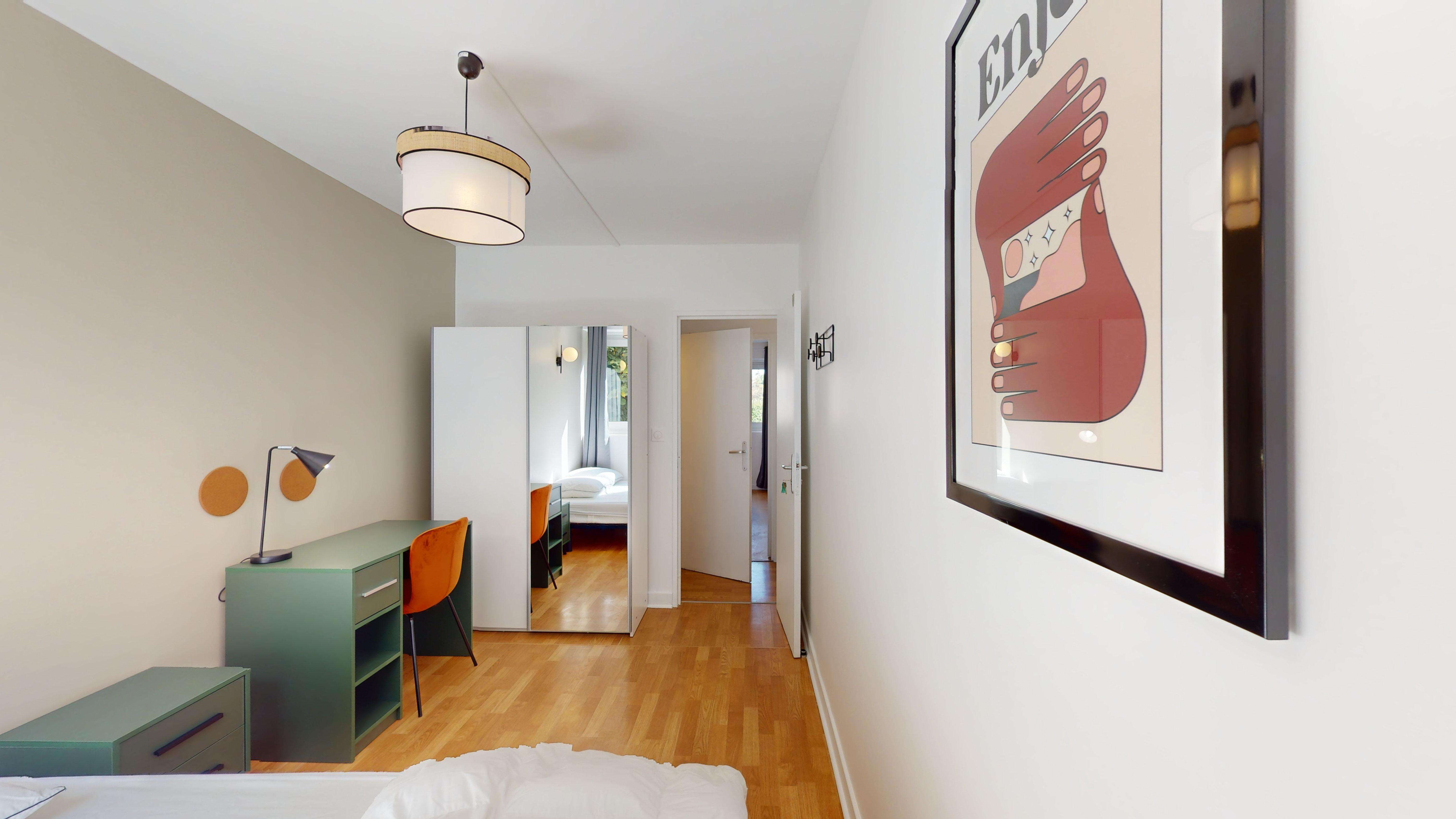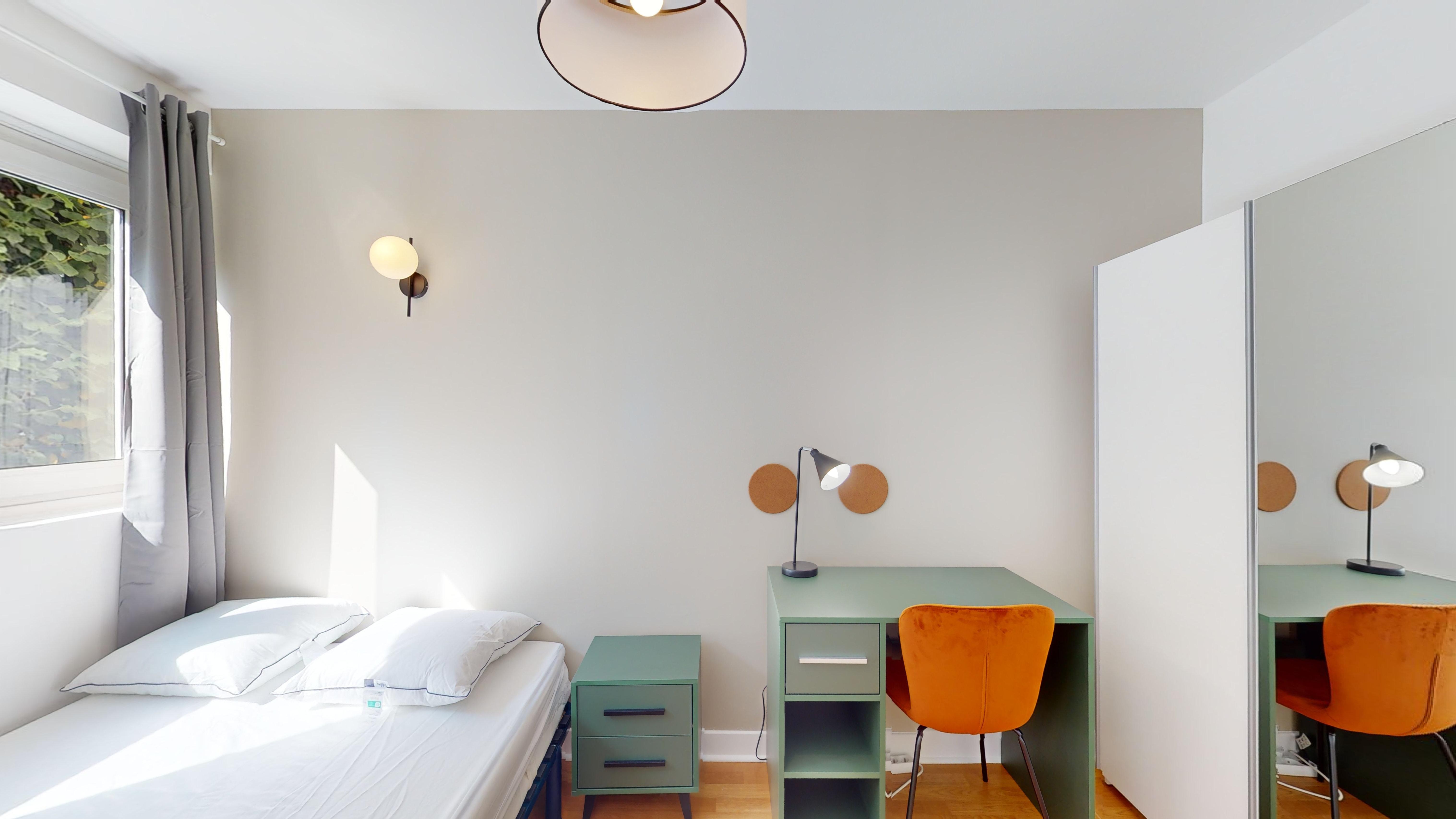 La chambre Room 5 est parfaite pour une personne. Elle dispose d'un lit double confortable, d'une armoire pour vos affaires, d'une chaise et d'un bureau pour travailler ou étudier. La chambre partage une salle de bain moderne avec d'autres locataires, garantissant intimité et confort.