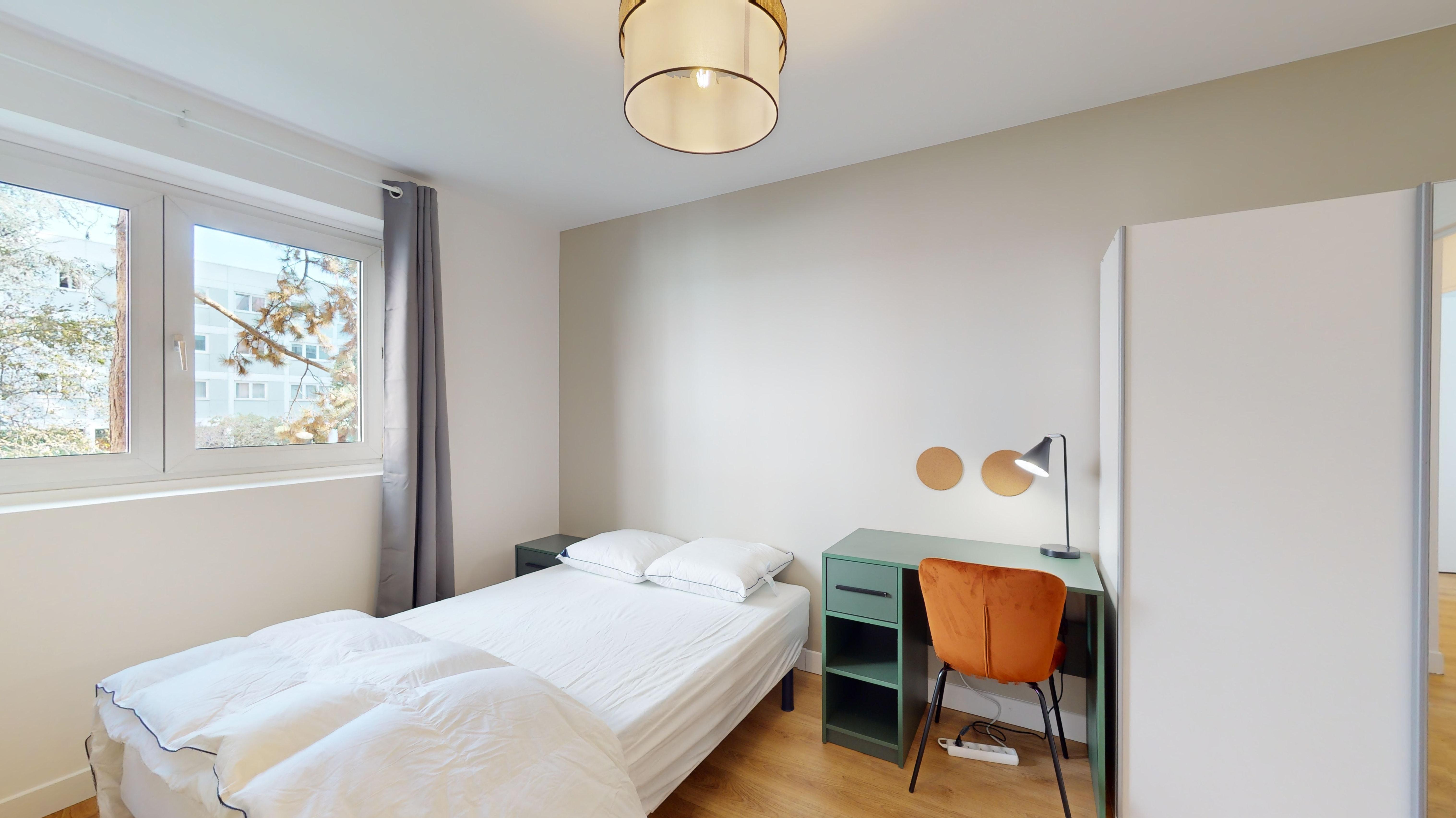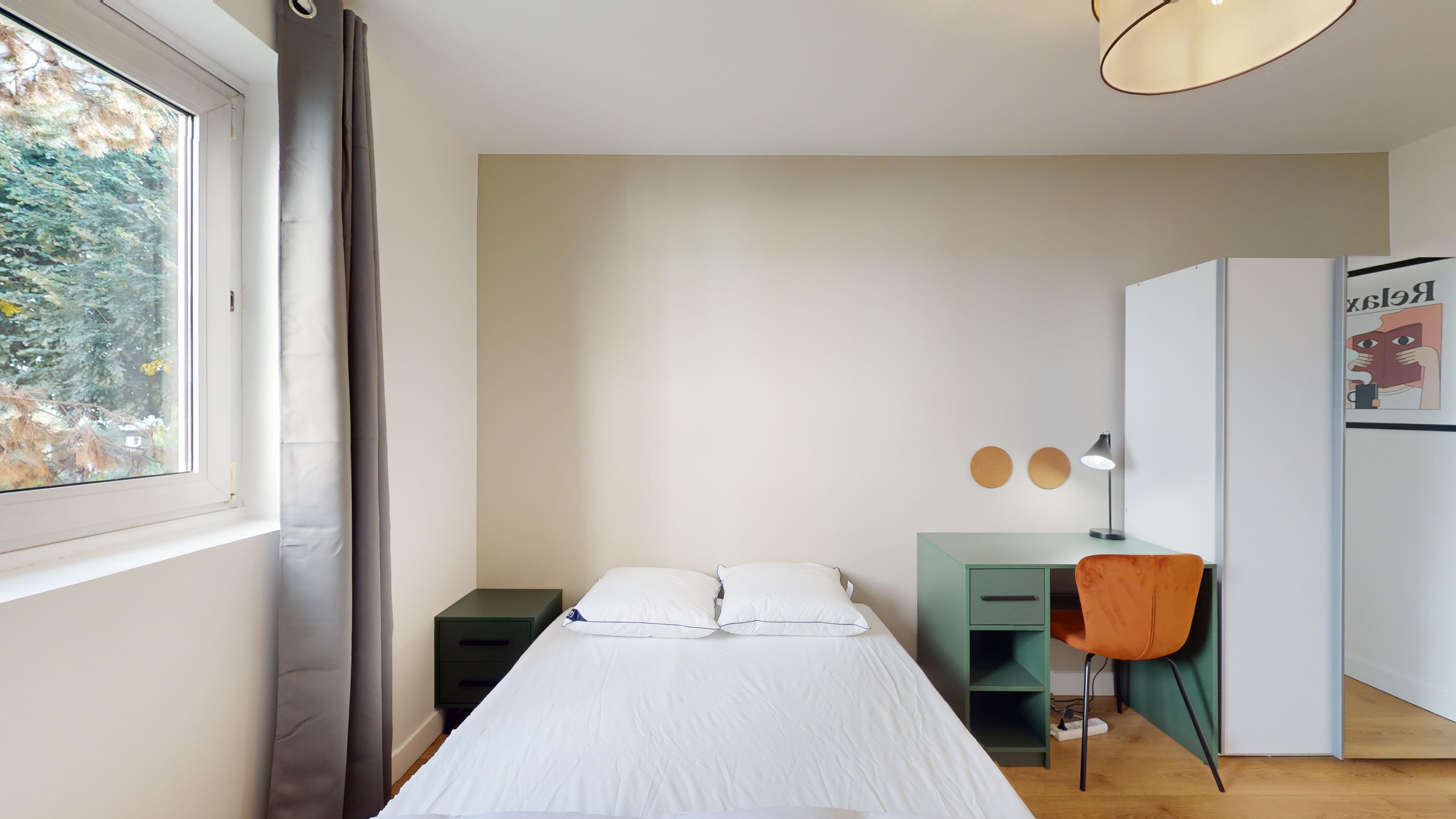 La chambre Room 7, d'une superficie de 12 m², est spécialement conçue pour une personne. Elle est meublée d'un lit double confortable, d'une armoire pour vos affaires, d'un bureau et d'une chaise pour travailler ou étudier. La chambre bénéficie aussi d'une connexion internet haut débit et partage une salle de bain moderne avec d'autres locataires.