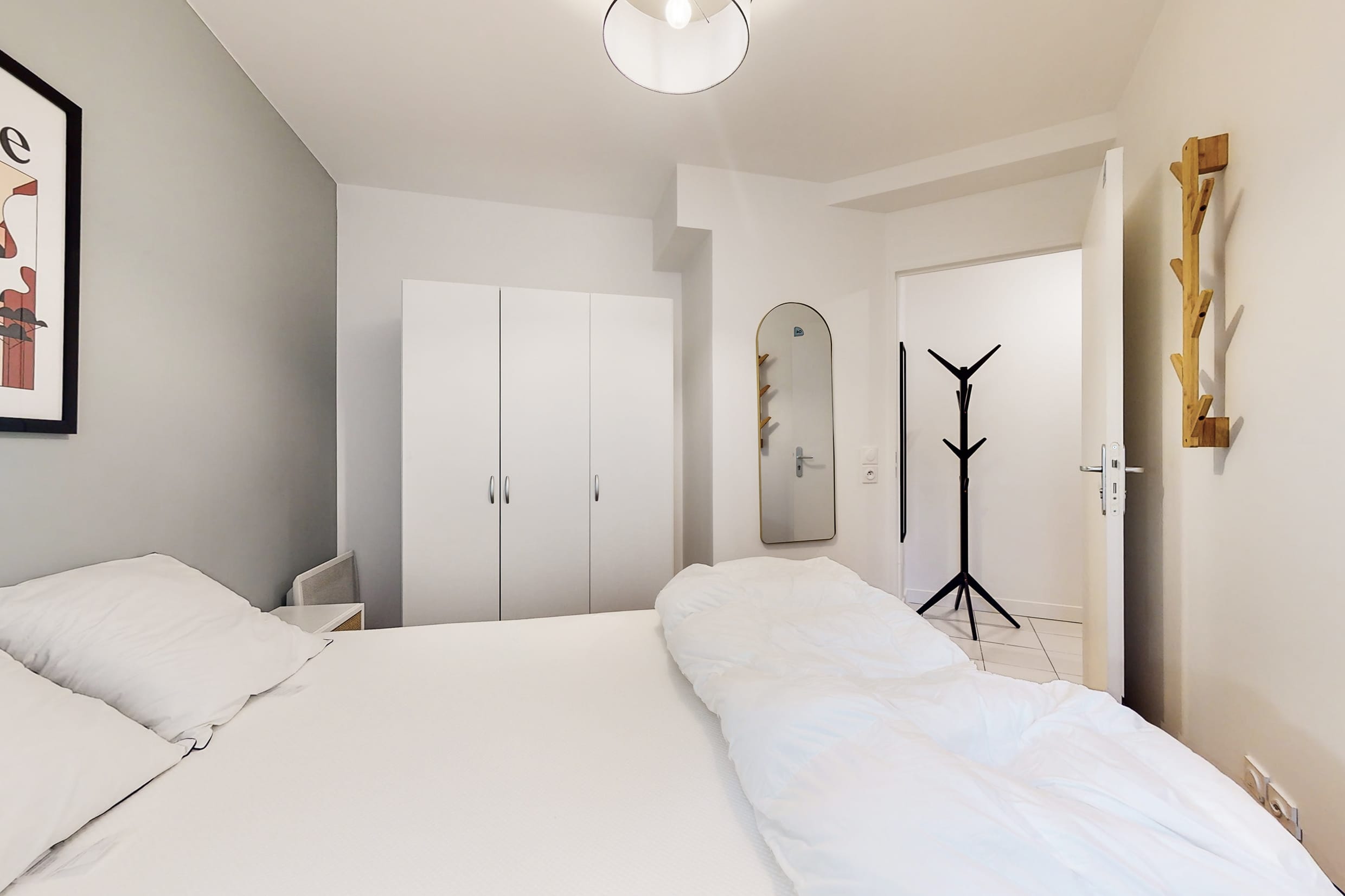 Votre chambre privée est un havre de paix. Elle est meublée avec un lit confortable, un bureau pour travailler et des rangements pour vos affaires. La salle de bain attenante est moderne et juste pour vous.