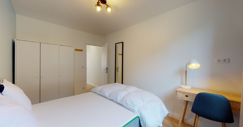 La chambre 6, conçue pour une personne, est un petit cocon de 12 m² avec un lit double confortable, une armoire pour vos affaires, et un bureau pour travailler ou étudier. La salle de bain est partagée et comprend tout ce qu'il faut : douche, lavabo et toilettes.