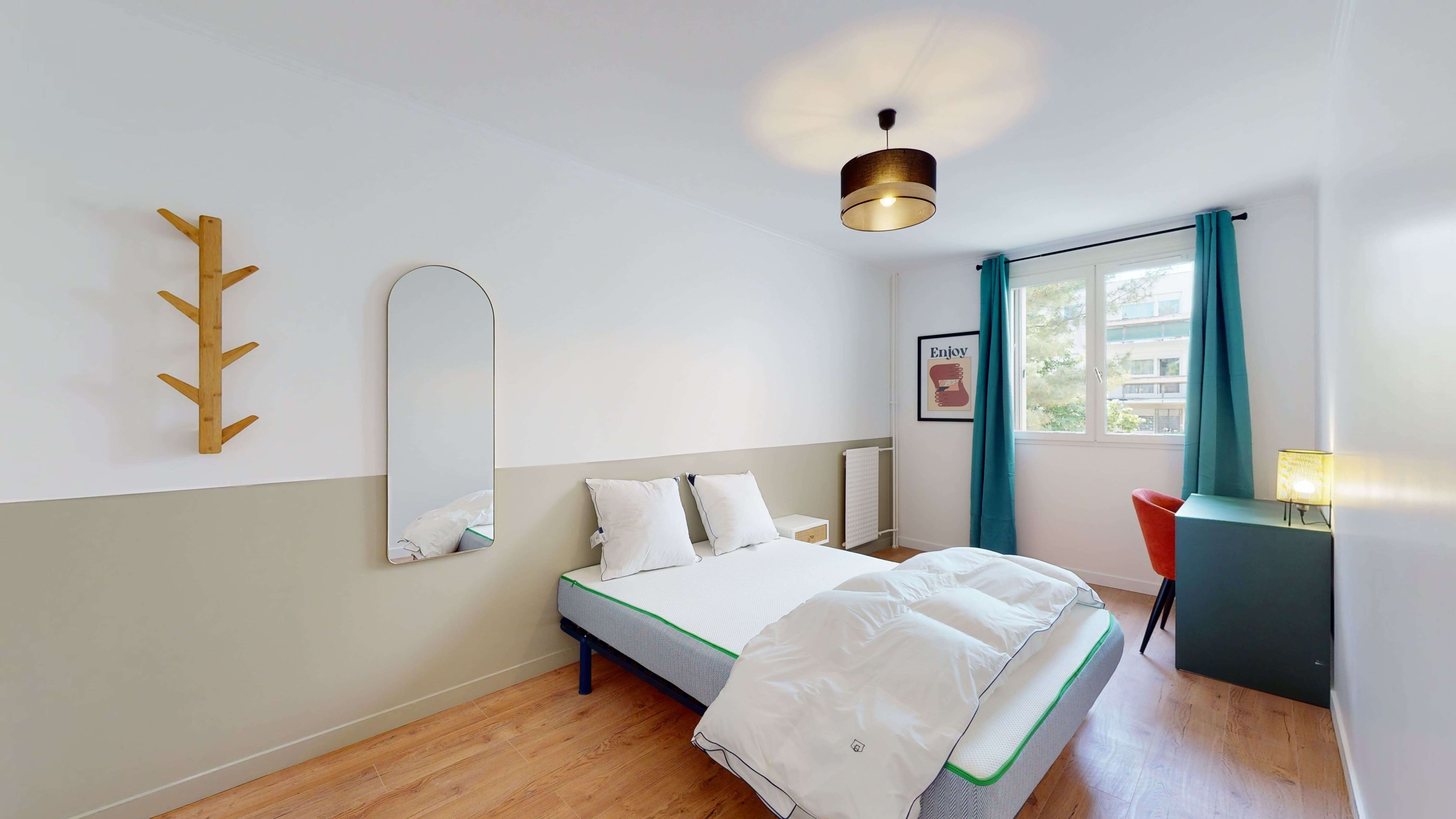 La chambre, nommée Room 2, est conçue pour une personne. Elle est douillette avec un lit double et une literie de qualité, une armoire pour vos affaires, un bureau pour travailler et une chaise. La chambre de 11 m² partage une salle de bain moderne avec d'autres locataires. Elle est équipée d'internet haut débit et d'autres commodités pour votre confort.
