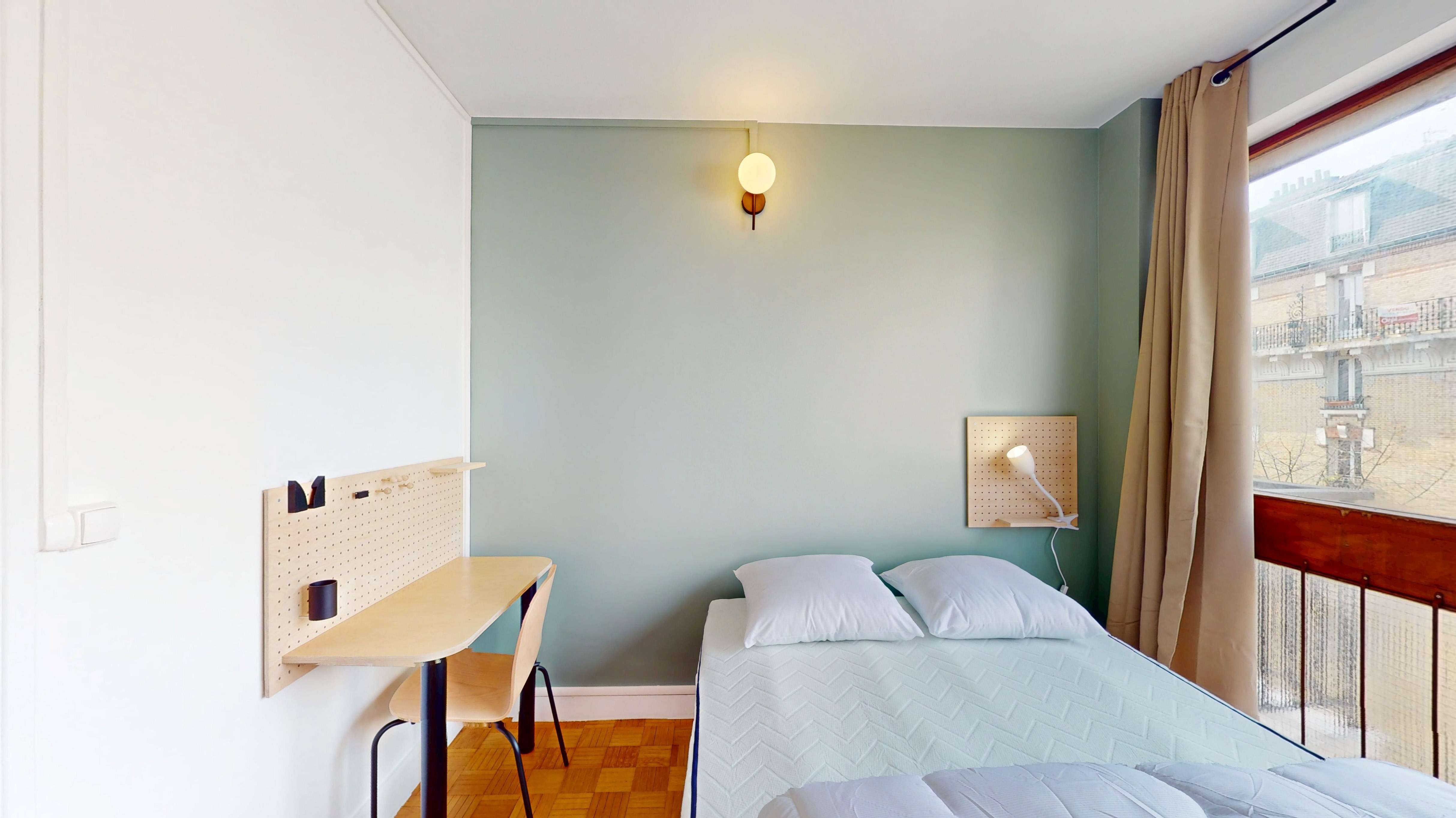 Votre chambre privée est un havre de paix. Elle comprend un lit confortable, un bureau pour travailler et des rangements pour vos affaires. La salle de bain attenante est moderne et pratique avec une douche à l'italienne. Le mobilier est fonctionnel et en parfait état, prêt à vous accueillir.