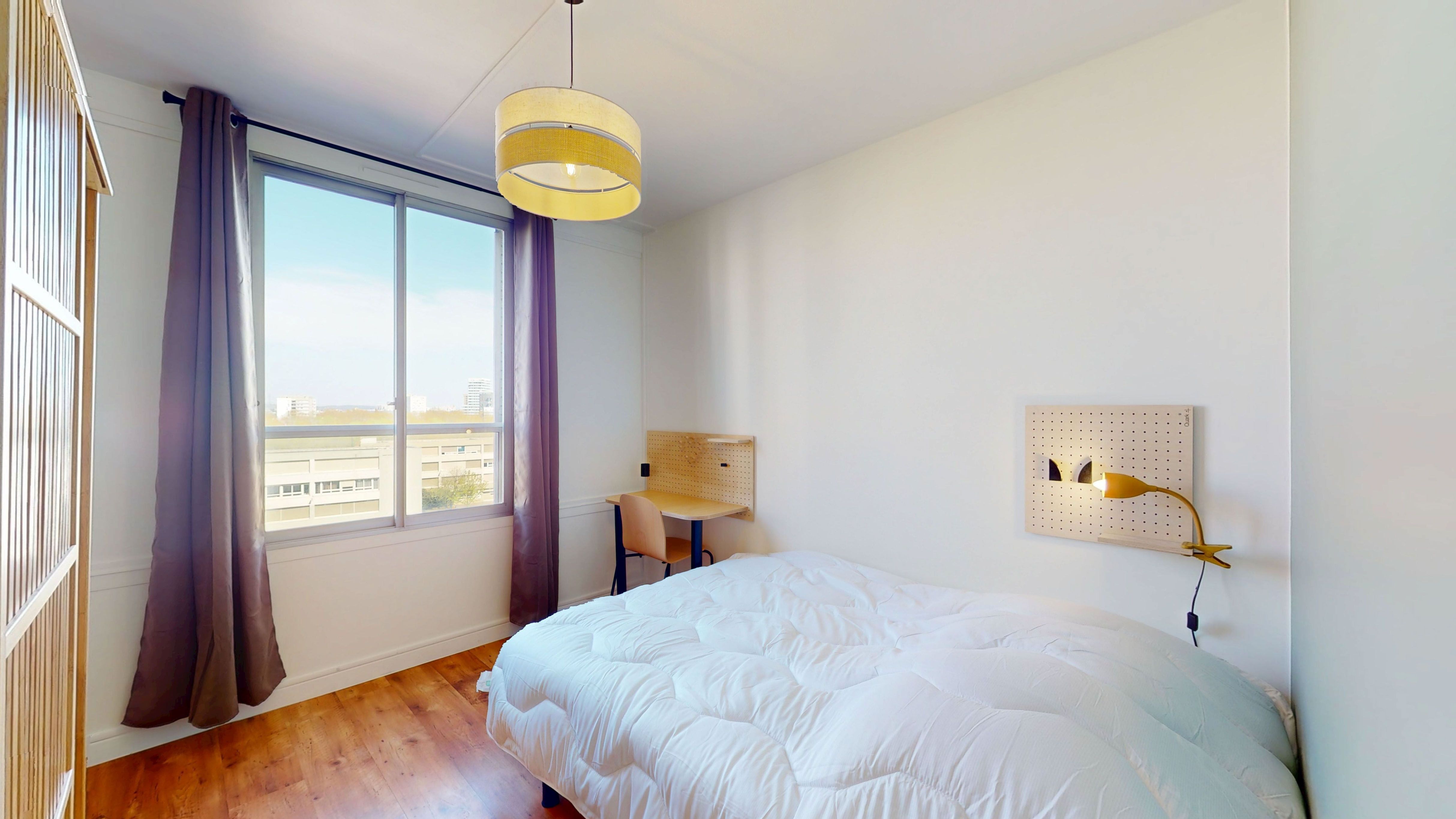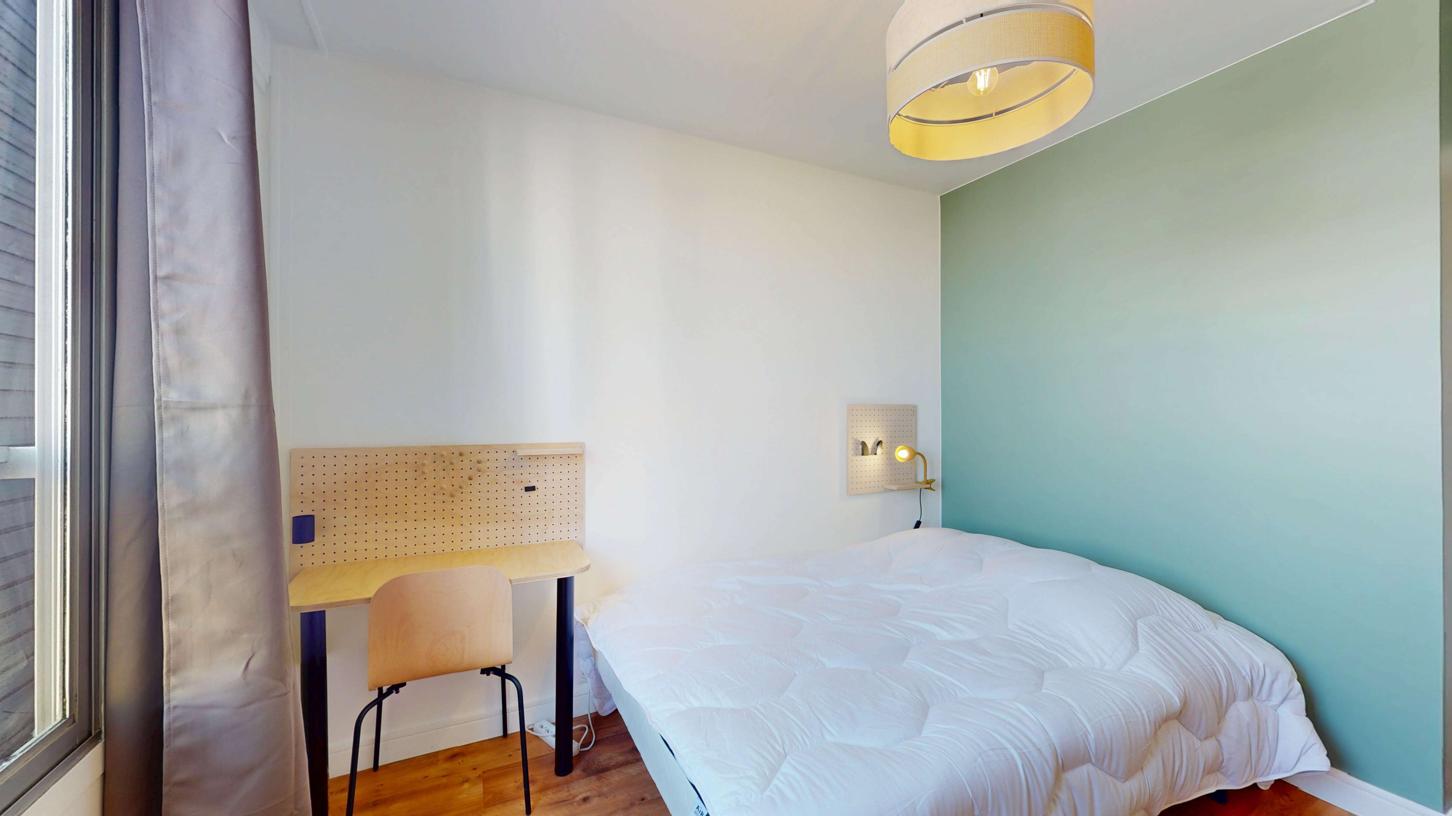 La chambre 3 est votre espace personnel de 9m2 où vous pouvez vous reposer et étudier. Elle est meublée d'un lit double confortable avec de la literie de qualité, d'une armoire pour vos vêtements, d'un bureau et d'une chaise pour travailler, ainsi que d'une connexion internet haut débit. La chambre dispose également d'un radiateur pour rester au chaud et d'une poubelle pour garder votre espace propre.