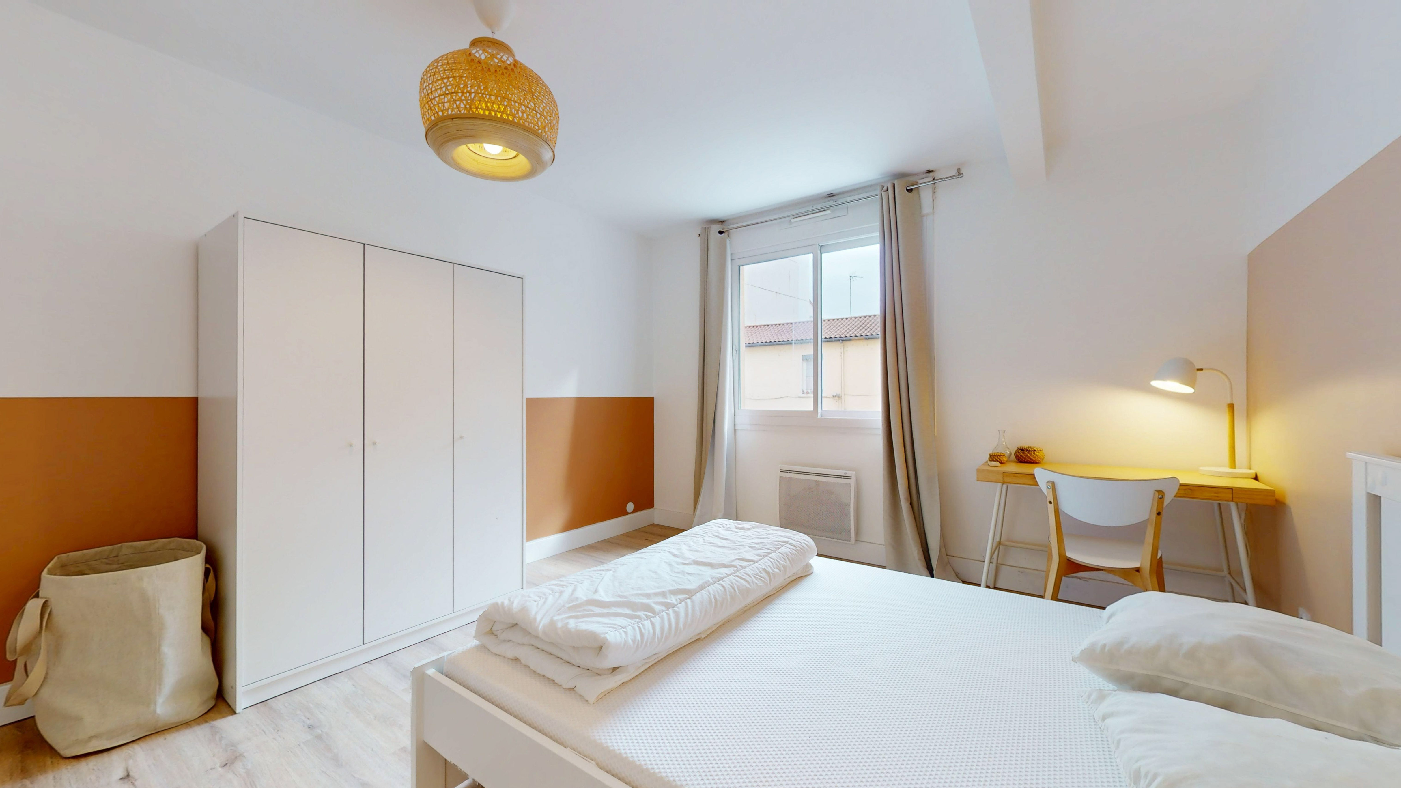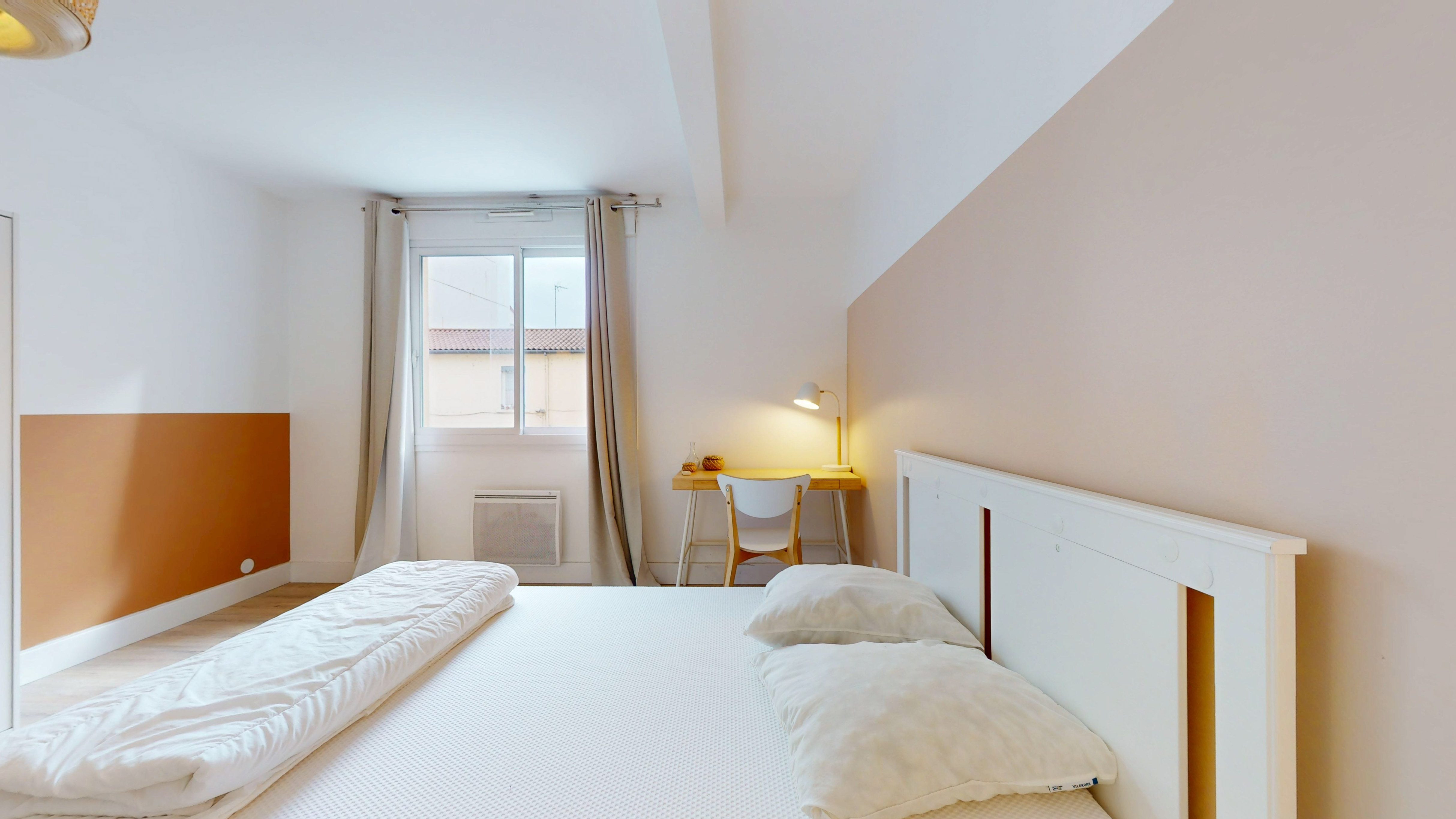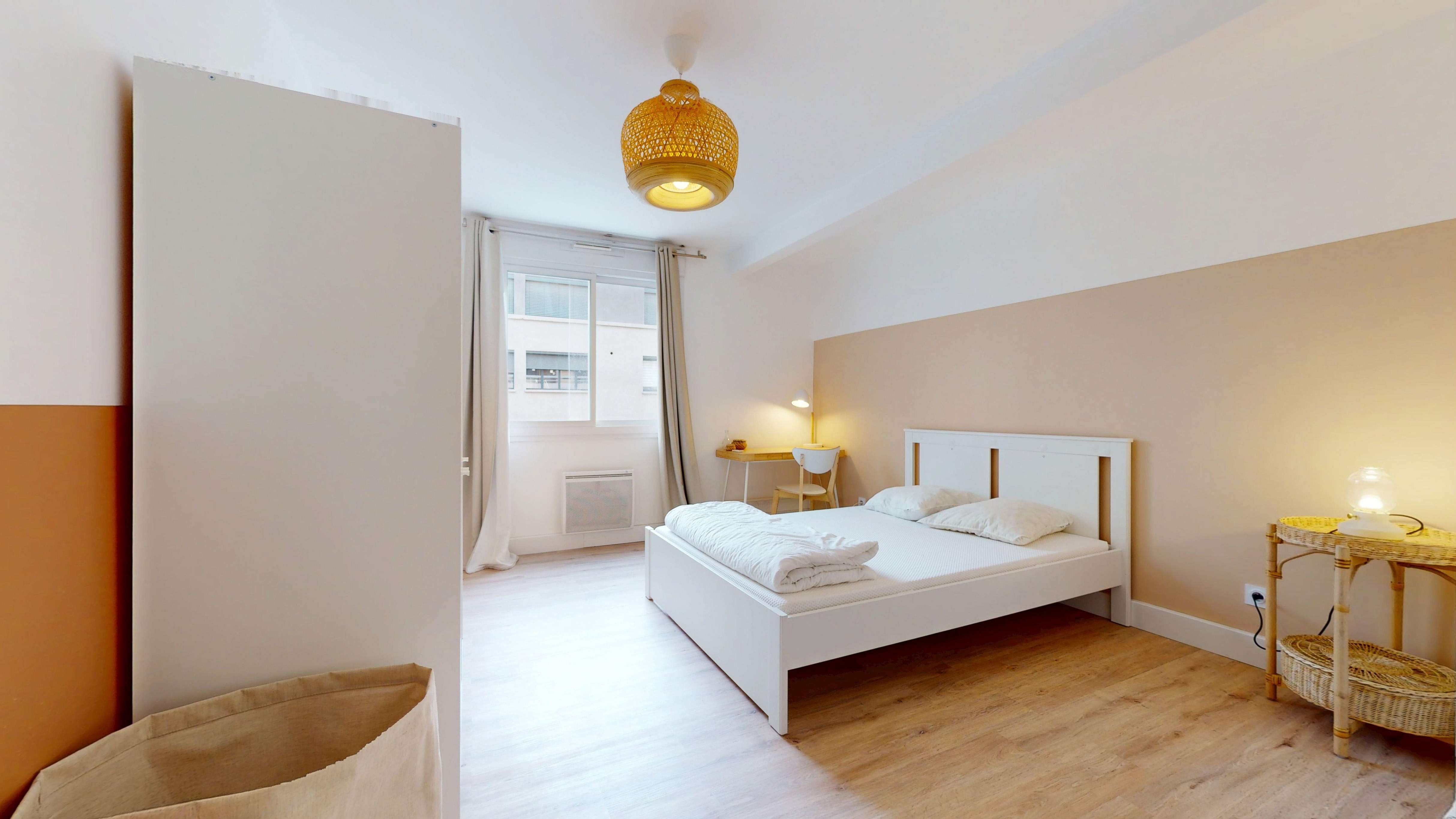 Votre espace personnel est une chambre confortable avec un lit douillet, un bureau pour travailler et des rangements pour toutes vos affaires. La salle de bain attenante est moderne et privée, garantissant votre intimité et confort.