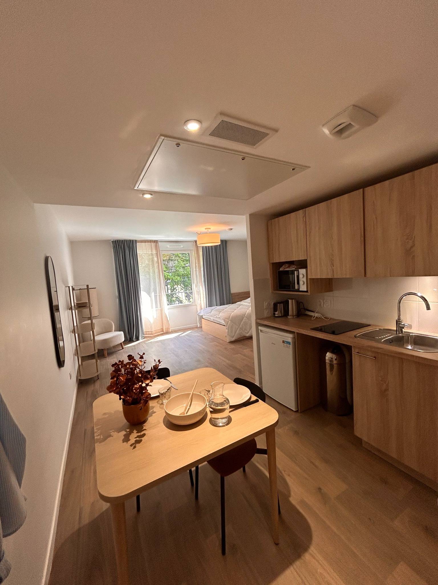 Découvrez ce charmant studio de 33.3 m², parfait pour une personne. Avec une salle de bain privée équipée d'une douche, un lavabo et des toilettes, vous aurez tout le confort nécessaire. L'espace de vie est bien organisé avec une armoire pour vos vêtements, un fauteuil confortable pour se détendre, une table et des chaises pour vos repas ou travailler. La kitchenette est pratique avec un évier, des plaques de cuisson pour préparer vos plats, un micro-ondes et un réfrigérateur pour conserver vos aliments.
