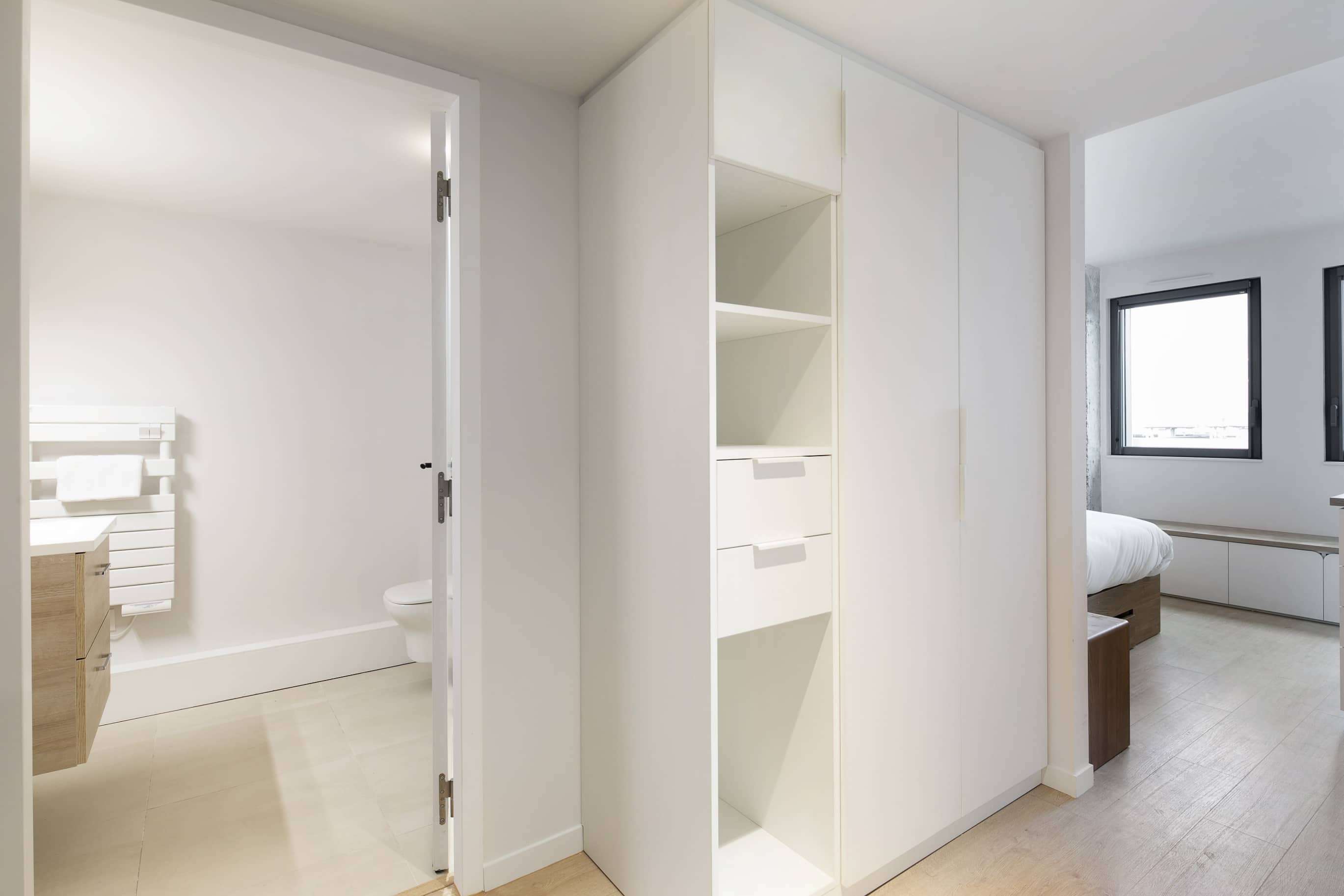Votre studio privé, le Studio - 710, se trouve au septième étage et offre tout le confort nécessaire pour un séjour agréable. Avec sa superficie de 22m2, il est meublé d'un lit double avec rangement intégré, d'une armoire pour vos affaires, d'un bureau et d'une chaise pour travailler ou étudier. La salle de bain privative est équipée d'une douche moderne, d'un lavabo et de toilettes. Vous y trouverez également des draps de qualité supérieure et tout le nécessaire pour vous sentir chez vous.