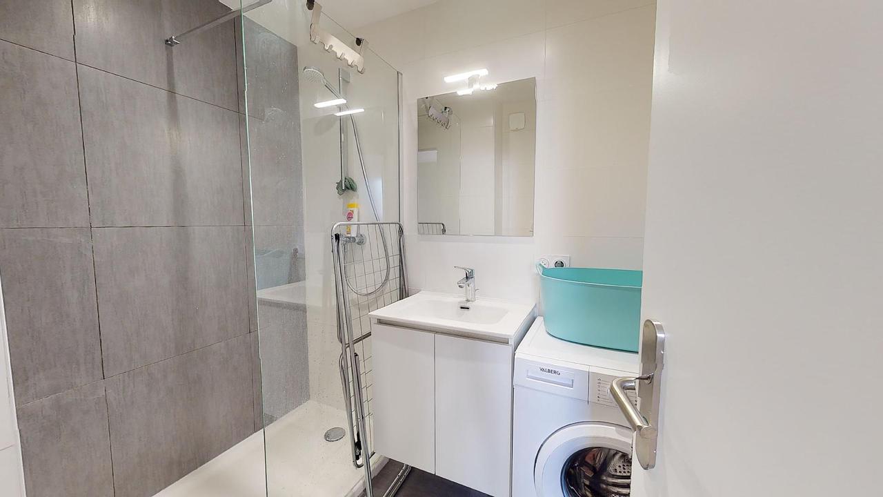 Une salle de bain avec douche; meuble vasque et machine à laver