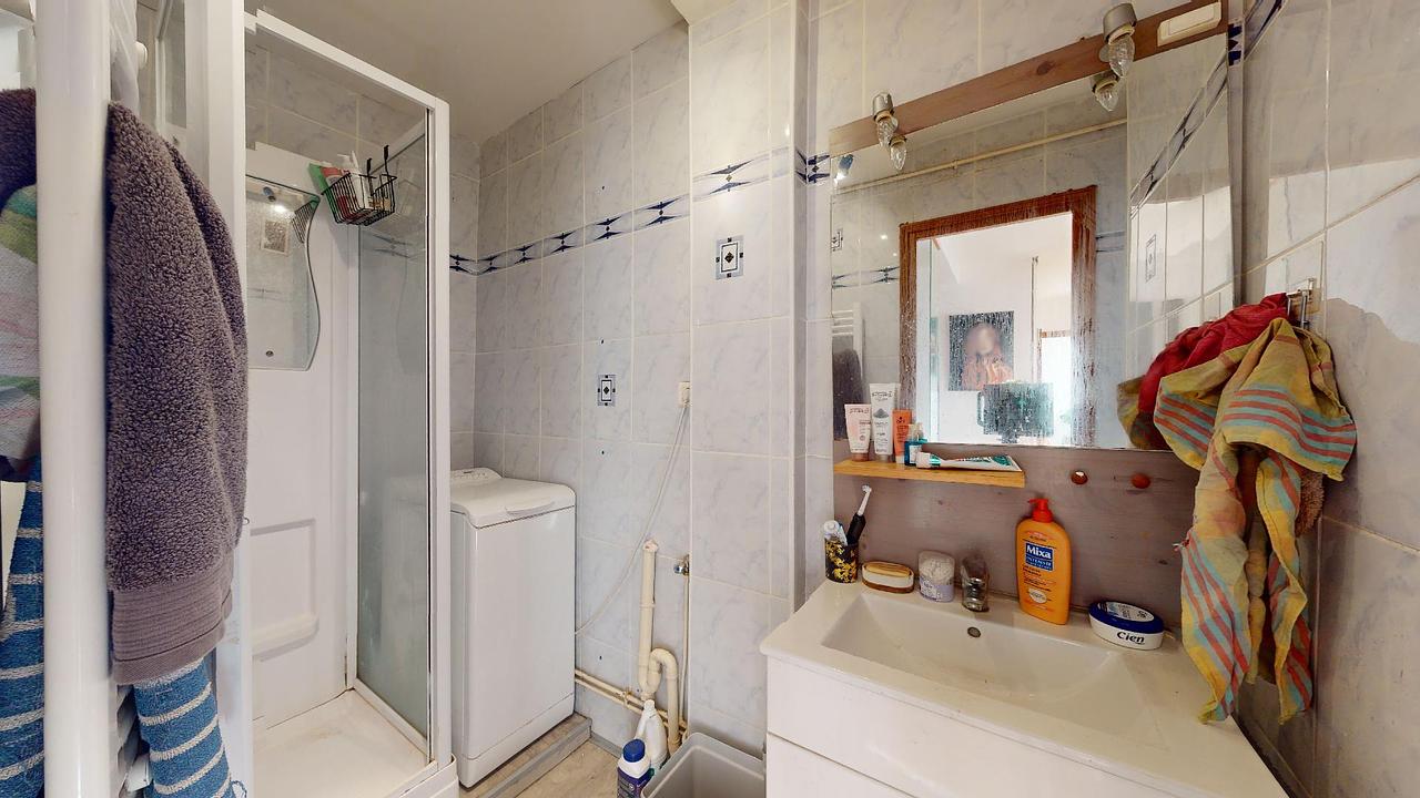 La salle d'eau est équipée d'un meuble vasque et d'une douche, ainsi que d'une machine à laver.