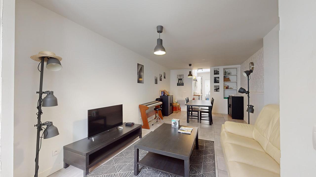 Le logement dispose d'un grand séjour équipé d'un canapé, d'une table basse, d'une télévision ainsi qu'un piano et d'un espace salle à manger.