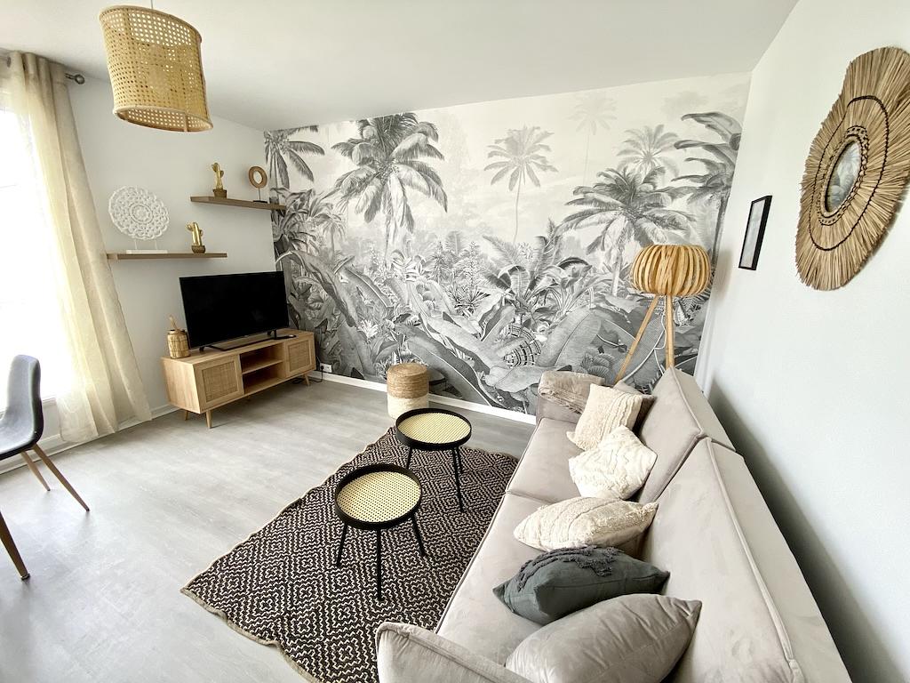 La pièce de vie est meublée avec un canapé, deux tables basses, un meuble télévision, une télévision ainsi qu'une table à manger et ses 3 chaises.