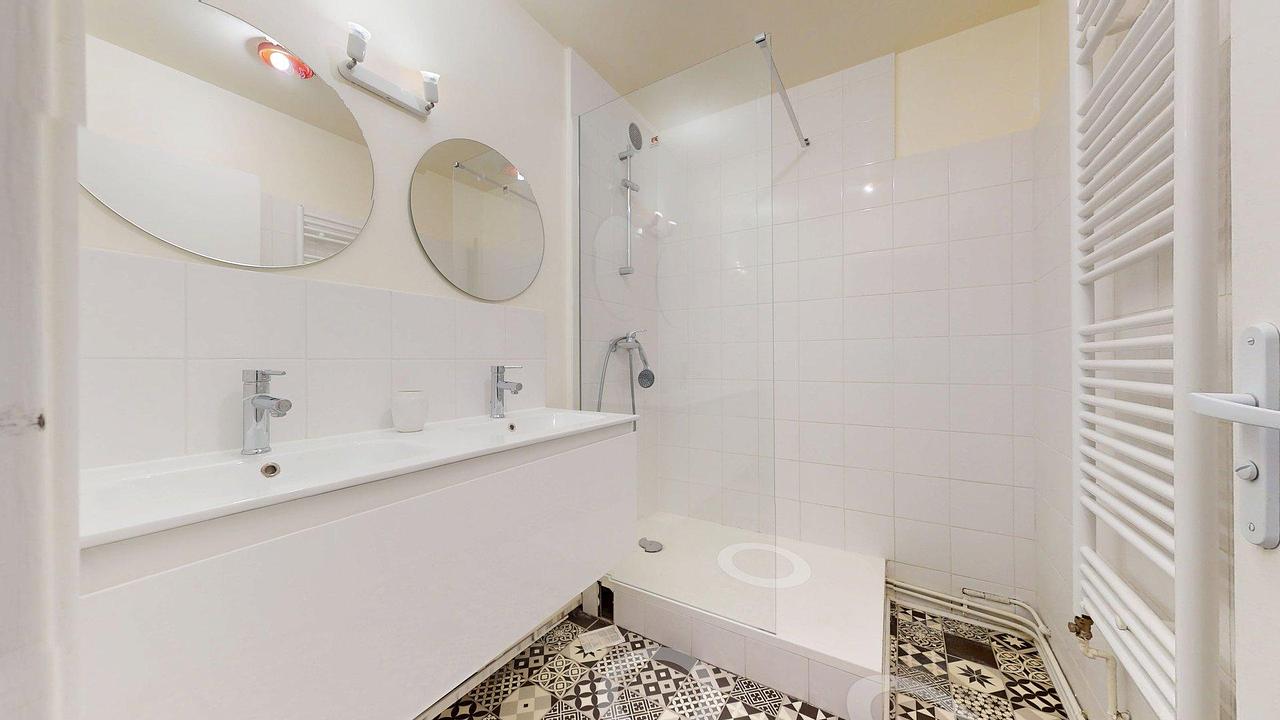Le logement dispose, au rez-de-chaussée, d’une salle d’eau comprenant une douche, une double vasque avec miroir, un sèche-serviette et des rangements, ainsi que de WC séparés. À l’étage, se trouvent trois autres salles d’eau équipées ainsi qu’un second WC indépendant.