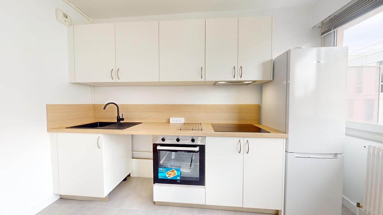 Le logement a été rénové en 2024. Il comporte deux chambres, meublés avec lit simple, bureau, et rangements. La cuisine, pièce de vie, est meublée de deux fauteuils ainsi qu'un mange debout pour deux. Elle est équipée avec frigidaire avec compartiment congélateur, four, plaques de cuisson et hotte ainsi que de nombreux rangements et ustensiles de cuisine.