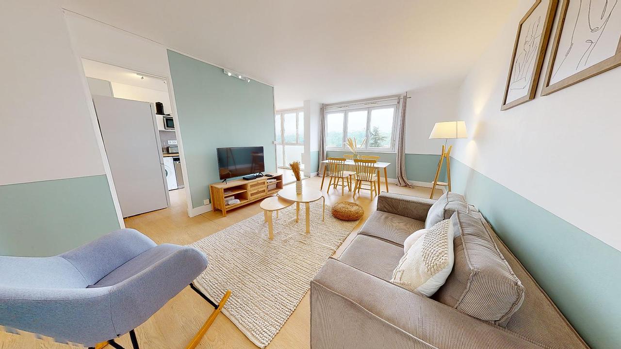 Le salon, très lumineux, est aménagé d'une table avec quatre chaises, idéal pour partager des repas entre colocataires, un canapé, deux tables basses, un fauteuil, un meuble TV avec télévision et plusieurs éléments de décoration ainsi qu'un placard mural.