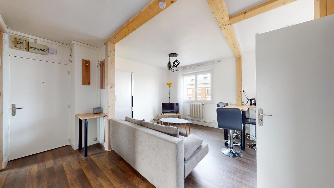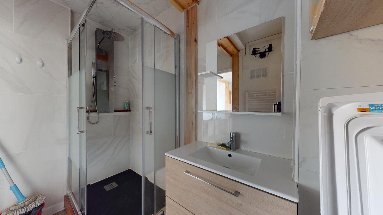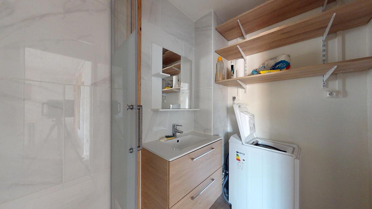 L'appartement présente une configuration où une entrée dessert l'ensemble des pièces. La cuisine, ouverte sur le salon, est bien équipée avec un réfrigérateur, des plaques de cuisson, une hotte, un four à micro-ondes, un lave-vaisselle, un évier, une machine à café, une bouilloire, une table haute et ses quatre tabourets. Dans la zone salon, vous trouverez un canapé, une table basse, une télévision ainsi que son meuble dédié. La salle de bain est dotée d'une cabine de douche, d'un meuble vasque et d'une machine à laver. De plus, les toilettes disposent également d'un meuble vasque.