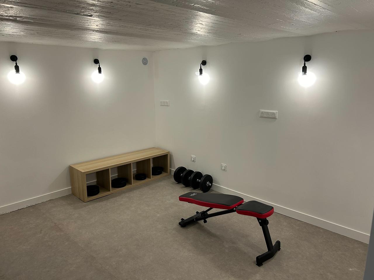 Un sous-sol idéalement meublé avec deux tables à manger, trois sèche-linge. Les propriétaires ont également installé des équipements sportifs.
