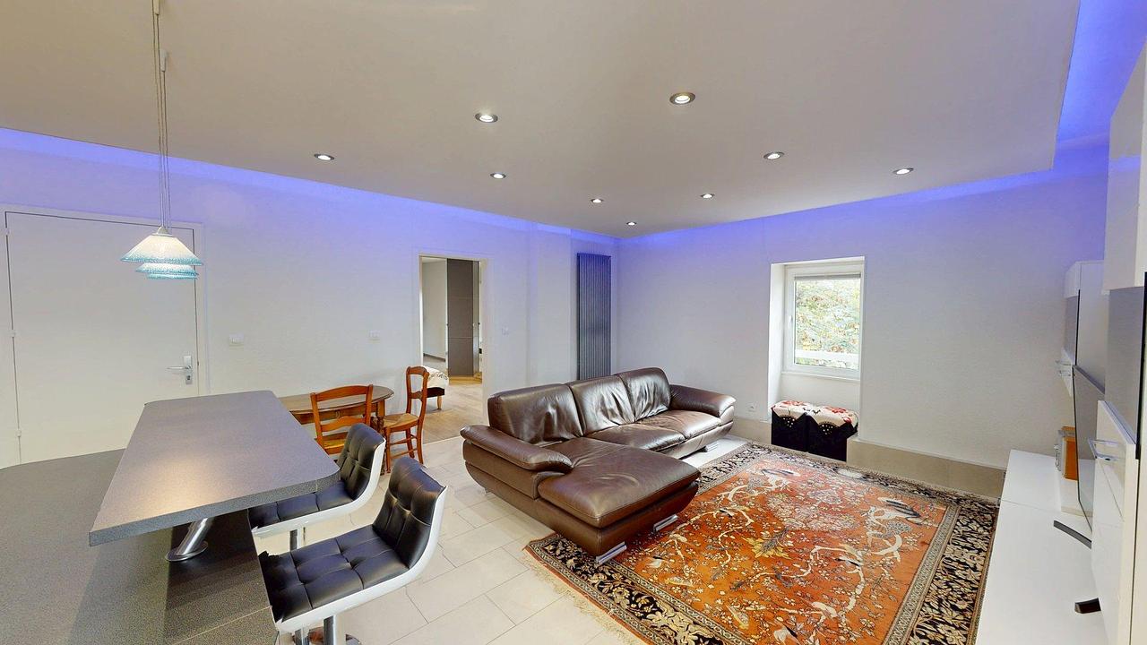 Traversant, l’appartement se distingue par sa luminosité naturelle et ses beaux volumes. La pièce de vie, particulièrement spacieuse, est entièrement meublée : canapé d’angle, meuble TV, télévision et rangements. L’éclairage d’ambiance crée une atmosphère chaleureuse et conviviale, parfaite pour se détendre. Une table à manger complète cet espace.