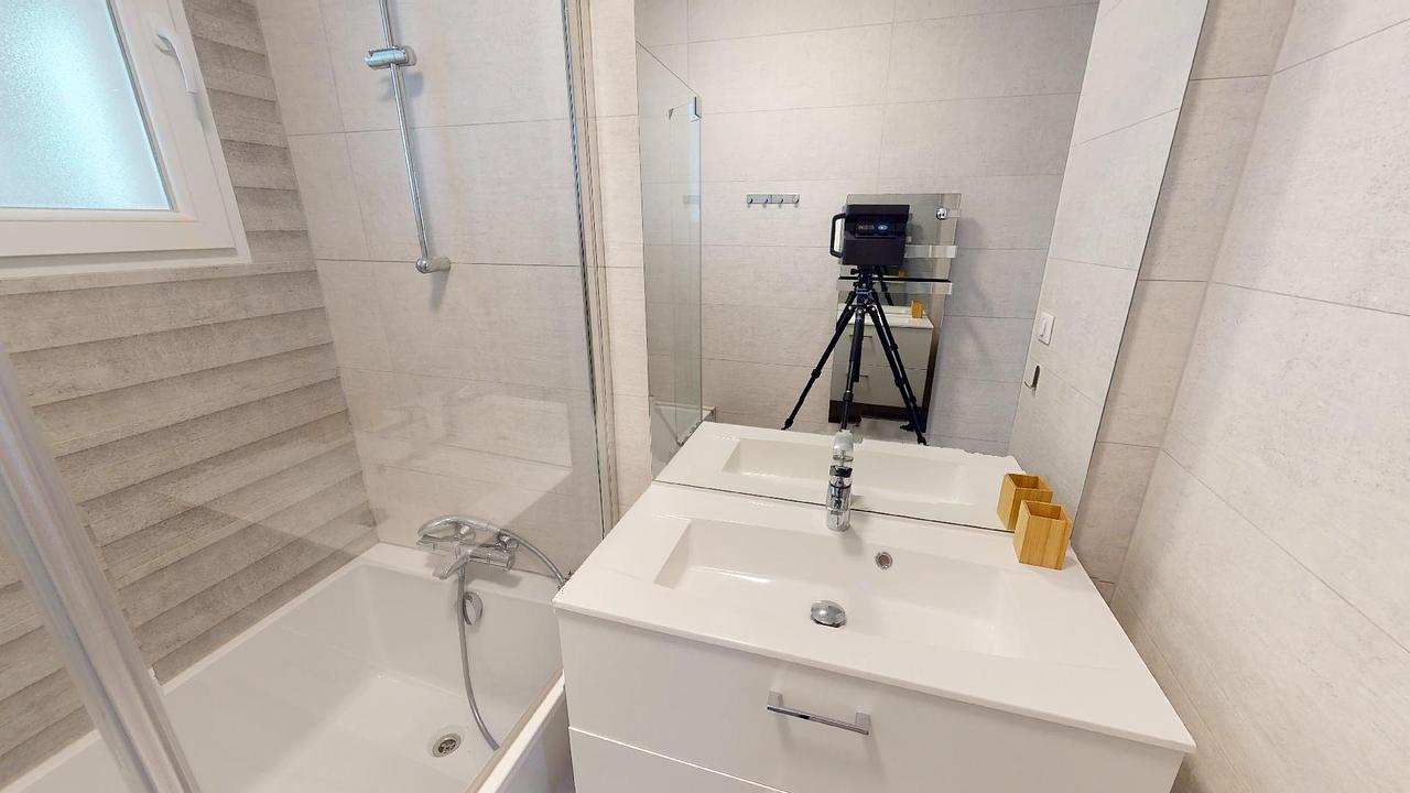 La salle de bain est équipée avec grande baignoire, un meuble lavabo, sèche serviette. Les toilettes sont séparées.