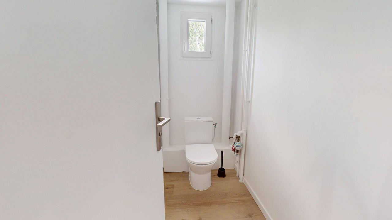 La salle d'eau dispose d'une cabine de douche, d'un meuble vasque avec un miroir ainsi que d'un WC. Des toilettes supplémentaires sont séparées.