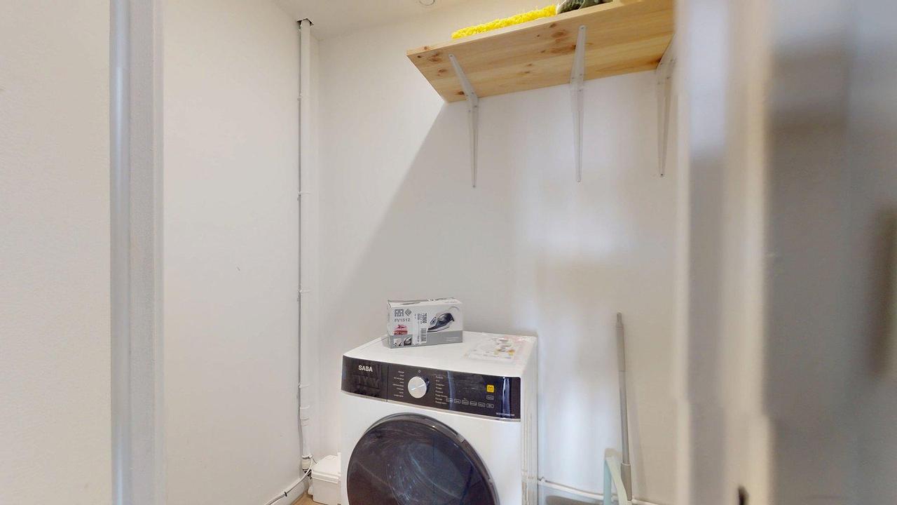 La buanderie accueille une machine à laver, un fer à repasser avec une table ainsi que du nécessaire de ménage.