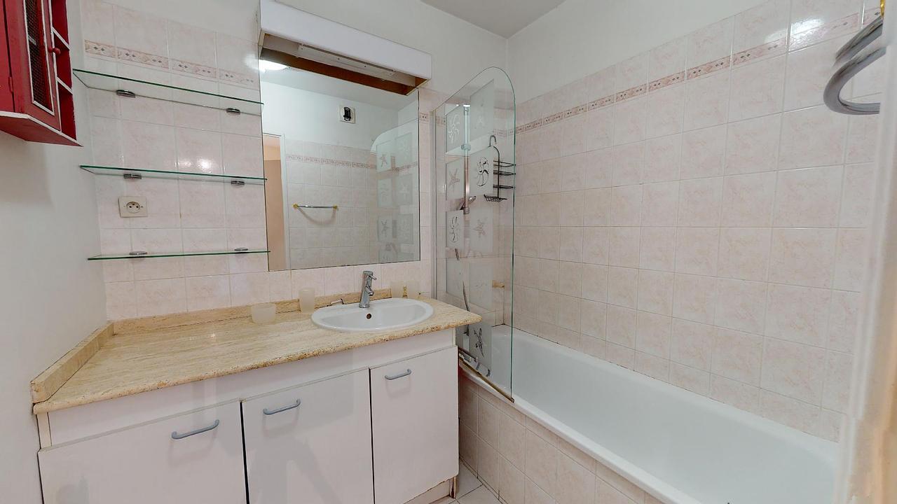 L'appartement dispose d'un salon équipé d'un canapé, d'un fauteuil, d'une table à manger ainsi que d'une télévision, de trois chambres, d'une cuisine et d'une salle de bains avec baignoire et douche.