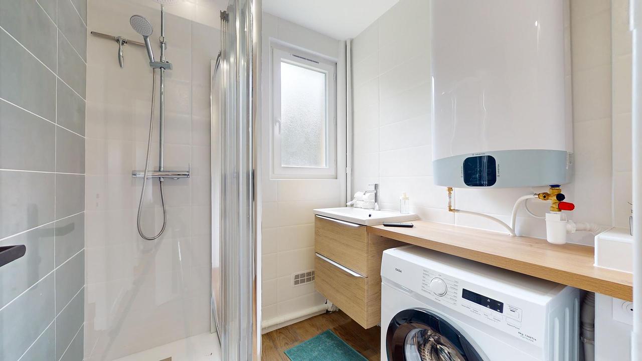 Deux salles d'eau complètent cet appartement : l'une avec meuble vasque, douche et lave-linge, la seconde avec meuble vasque, douche et toilettes.