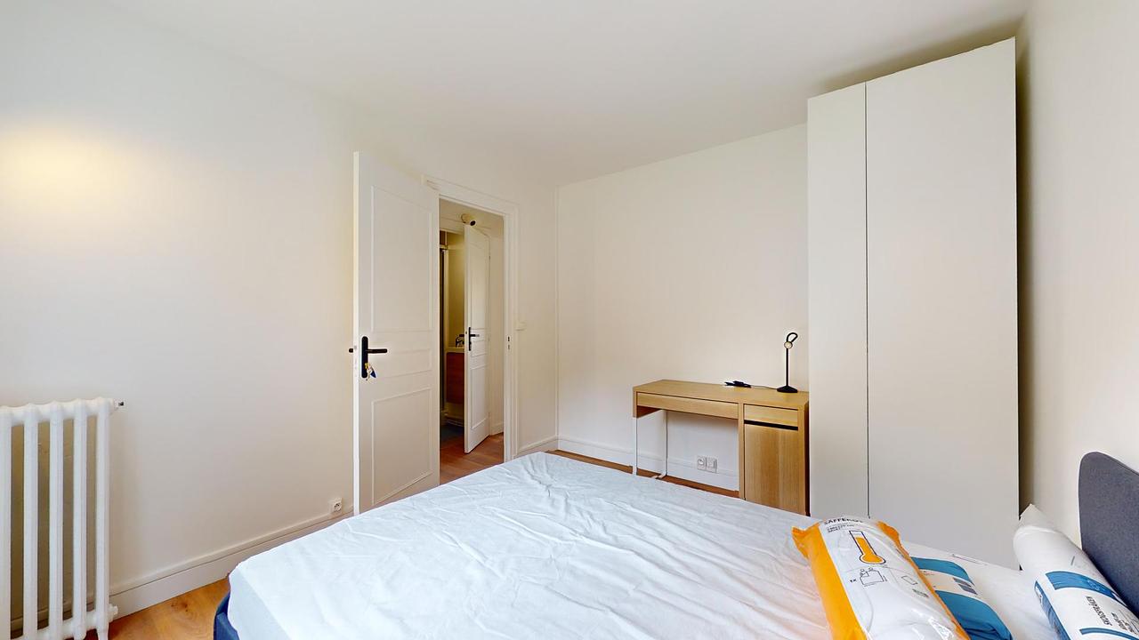 Cette chambre dispose d'un lit double, d'un bureau et de rangements. Le parquet au sol lui confère un ambiance chaleureuse.