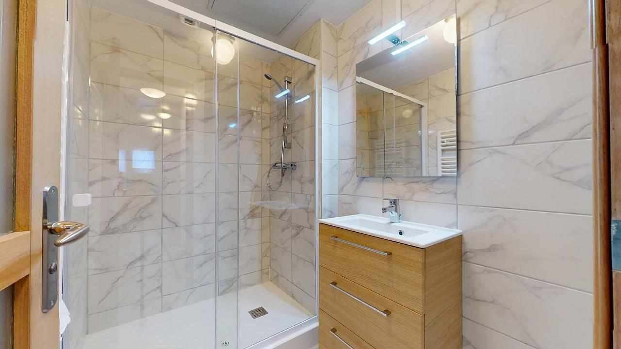 Au deuxième étage, vous trouverez deux des quatre chambres, dont l'une possède sa propre salle de bain privative. Le troisième et dernier étage abrite les deux autres chambres, ainsi que la troisième salle de bain, qui comprend une douche, un meuble vasque et des toilettes.