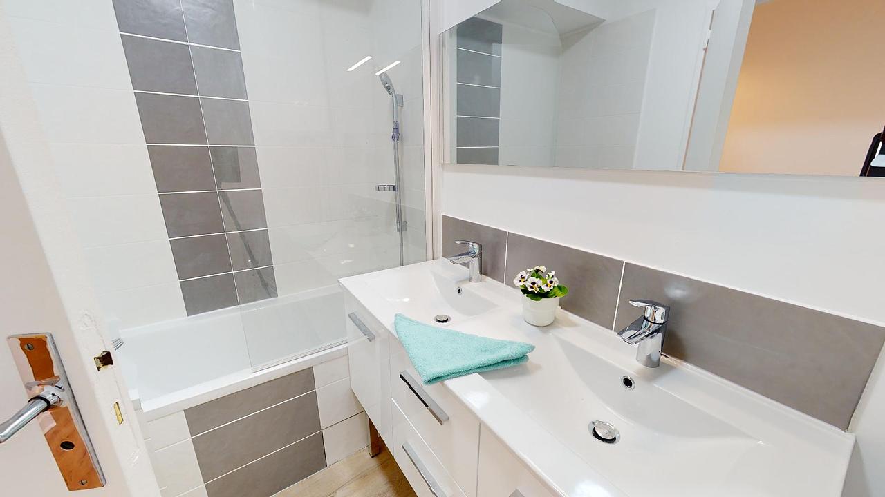 Cette colocation dispose de deux WC ainsi que de deux salles de bain. La première est équipée d'une cabine de douche, un meuble vasque et d'un miroir. La seconde dispose d'une grande baignoire, un meuble double vasque avec un grand miroir et d'une machine à laver.