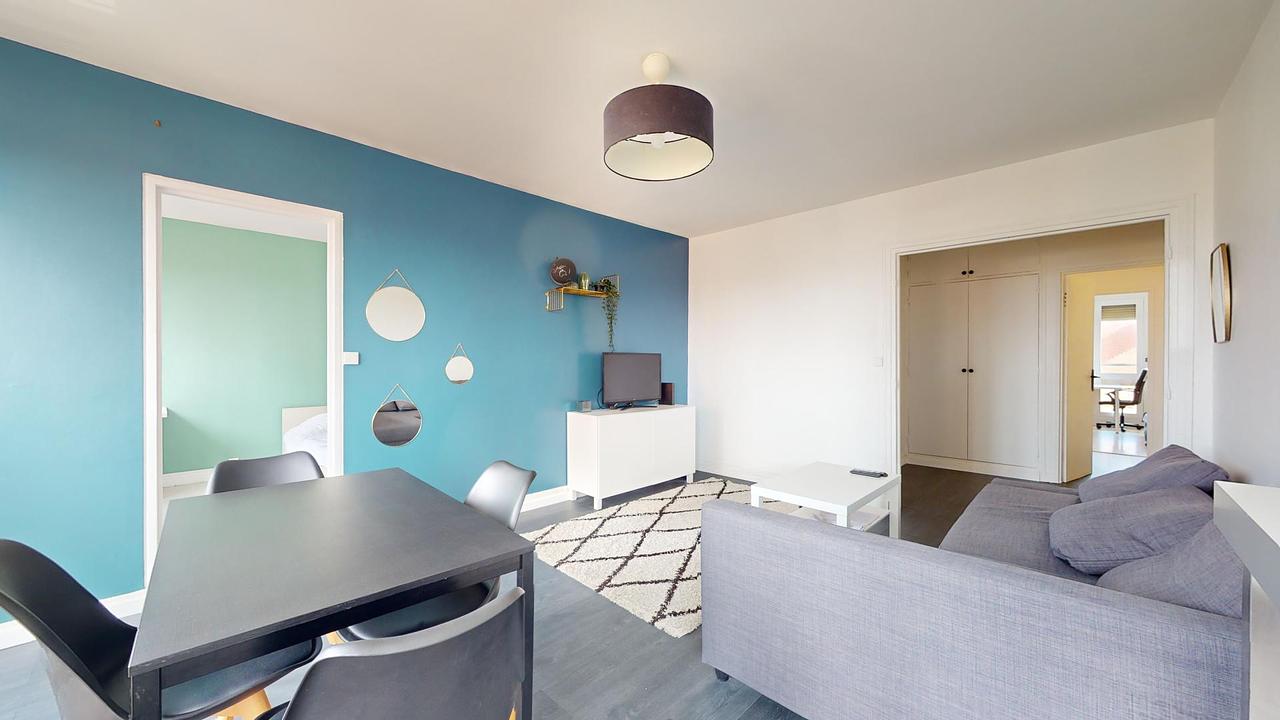 L'appartement s'ouvre sur une entrée avec rangements desservant un lumineux séjour. Celui-ci dispose d'un canapé, d'une table basse, d'un meuble TV avec TV, et d'une table avec 4 chaises.