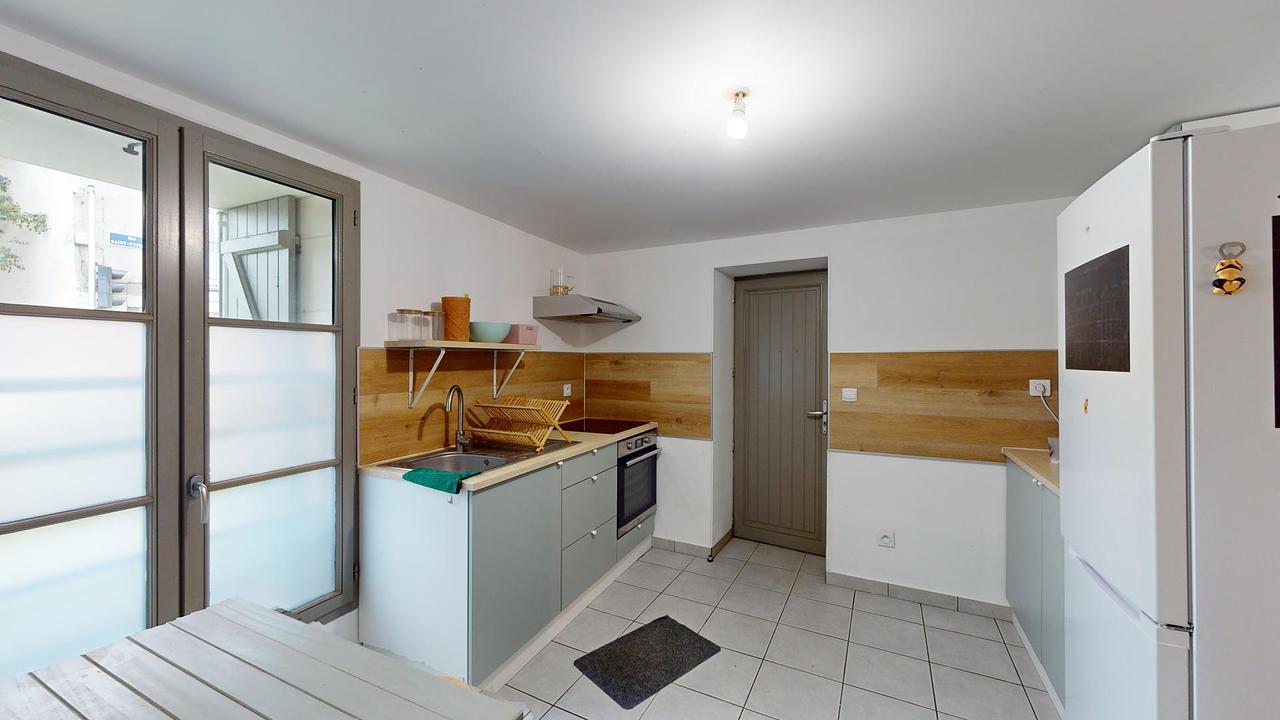 Ce T5 s'ouvre sur une entrée avec un placard mural et l'accès sur la cuisine et le séjour. La cuisine est équipée d'un évier, d'un four, de plaques de cuisson avec une hotte, d'un micro-ondes, d'une machine à café, d'un réfrigérateur avec congélateur, d'une table avec un tabouret et de nombreux rangements.