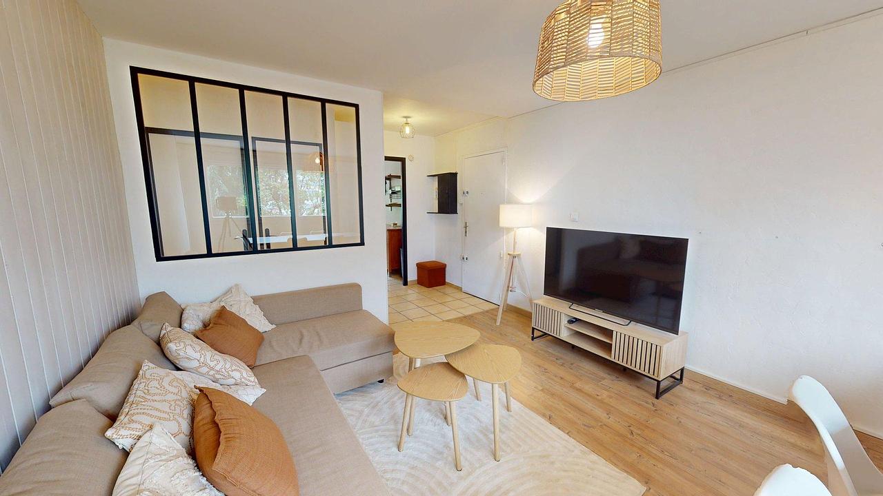 Séjour convivial : grand canapé d’angle, table basse, meuble TV avec télévision, table à manger. Le plus : il donne accès à une loggia, idéale pour profiter de l'extérieur.