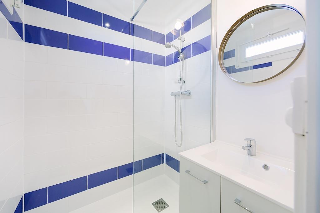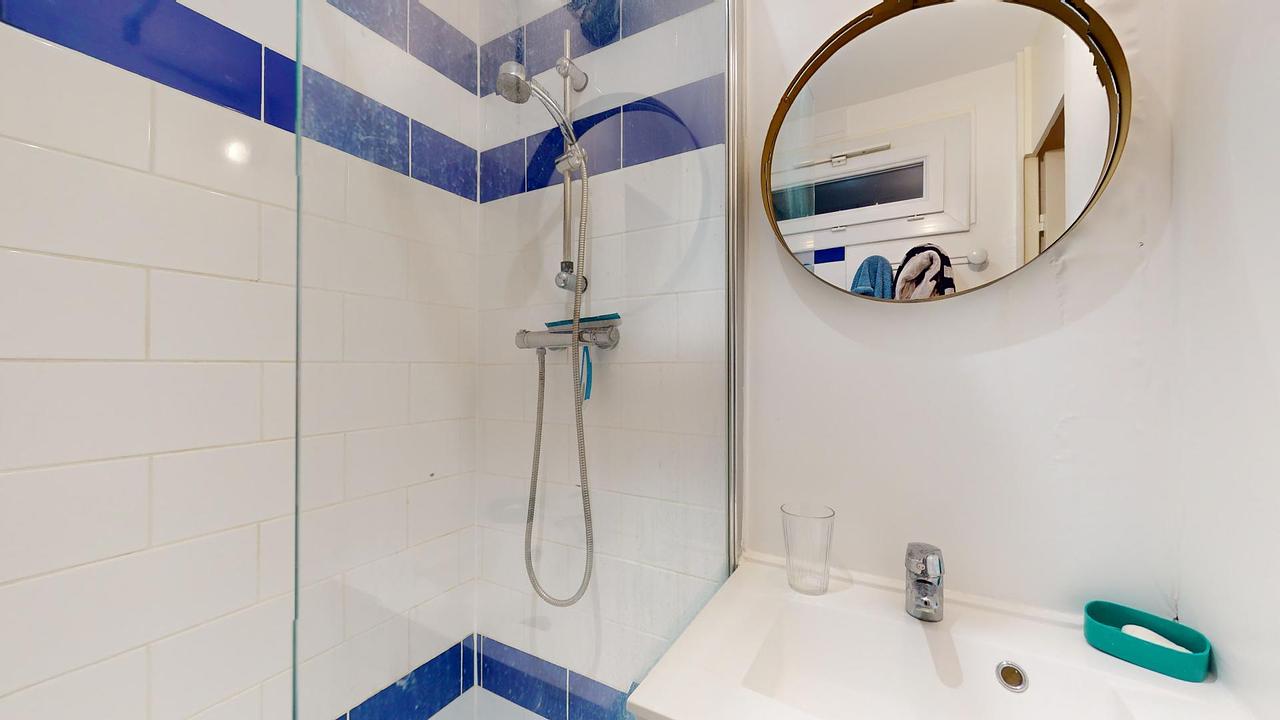 La salle d’eau dispose d’une grande douche, d’un meuble vasque avec un miroir ainsi que d’un WC.
